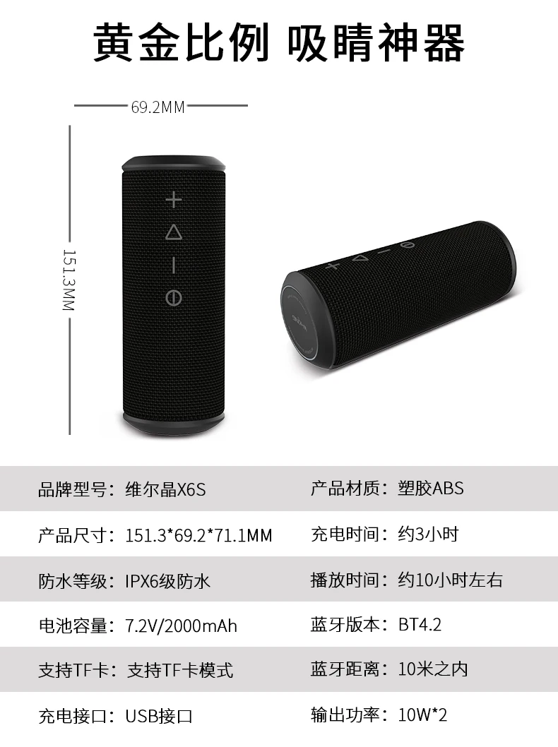 • Материал: ткань • Расстояние передачи: 10 м • Bluetooth 4,2, поддержка звонков, громкой связи, поддержка воспроизведения карт TF • Динамик: Φ 48 мм, внутренний Магнитный 10 Вт * 2. • Отображение двух часовых поясов подключение: беспроводной связи с Bluetooth или 3,5 мм аудио кабель • Встроенный литий-Перезаряжаемые Батарея: 7,4 V/2000mAh • Время зарядки: 3-4 часа • Время работы: 6-10 часов • Водонепроницаемость: IPX6 • Отношение S/N: ≥ 75 дБ • Размер: 181,3*69,2*71,1 мм • Вес: 460 г • Информация об упаковке: 1 x Bluetooth Динамик 1 х мини USB кабель 1x3,5 мм AUX кабель Руководство пользователя (1 шт.) 2 динамика могут использоваться как динамик TWS