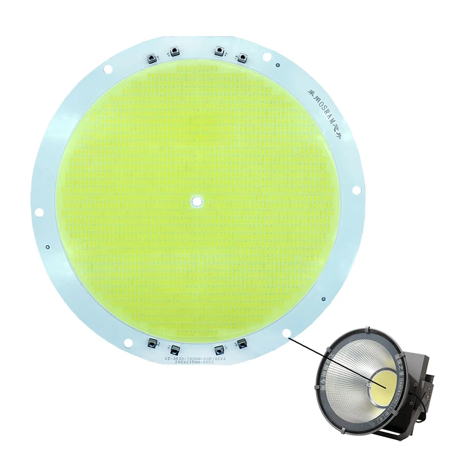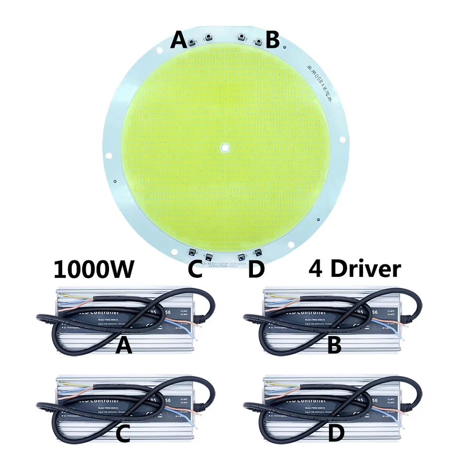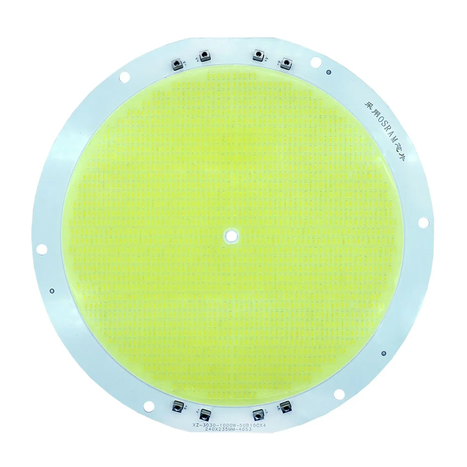 1000W светодиодный чип (Модель: Osram 1000W) Последовательный и параллельный режим: 50B10C x 4 Количество лампочек: 2000 шт Входное напряжение: 30-36 в Входной ток: 6500mAx4 светодиодный drver Световой поток: 140000 лм Ra≥ 95 Размер: диаметр 240 мм (9,45 дюйма) Вес: 350 г Толщина алюминиевой подложки: 2,0 мм Примечание: для правильной работы требуется четыре светодиодный драйвера 6500mA 1000 Вт.