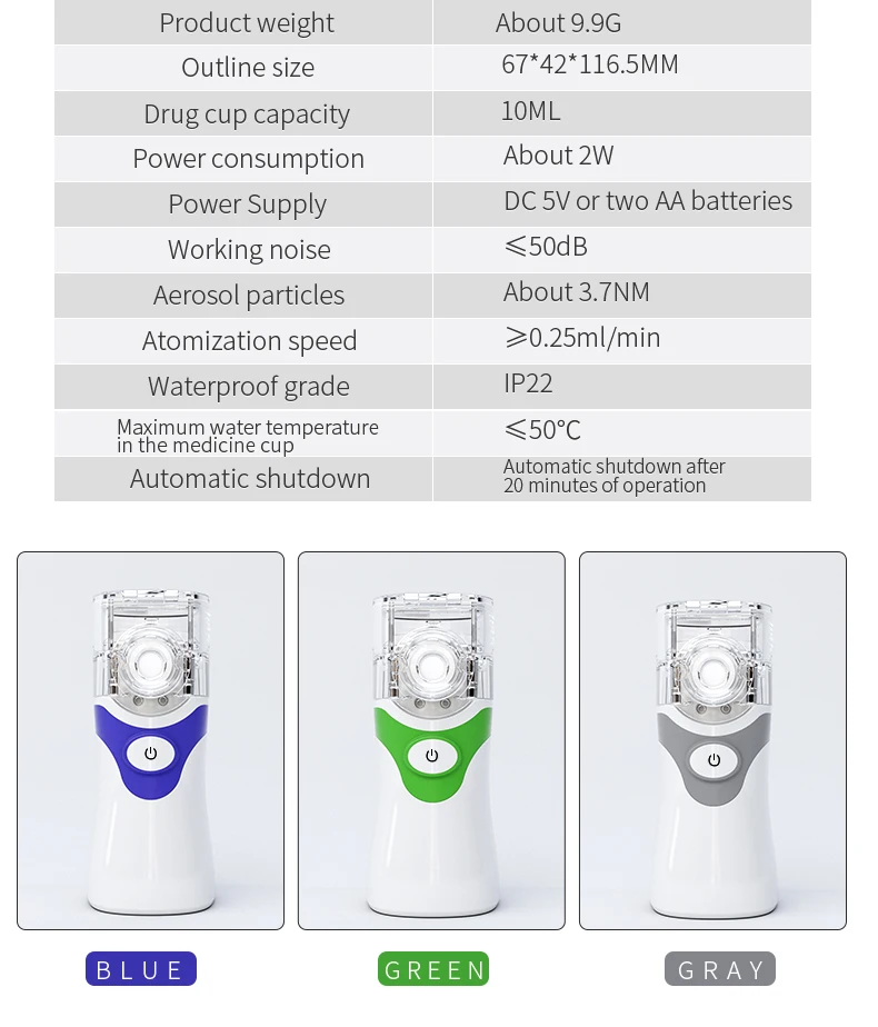 Вес изделия: 99 г Размер изделия: 67 × 42 × 105 мм Емкость чашки: 10 мл Мощность: 2 Вт Рабочий шум: ≦ 50 дБ Распыленные частицы: ≦ 3.7um · Распыление скорость: ≧ 025 мл/мин. Водонепроницаемость: IP22 Максимальная температура воды: ≦ 500C Другие функции: после 20 минут непрерывной работы автоматическое выключение.