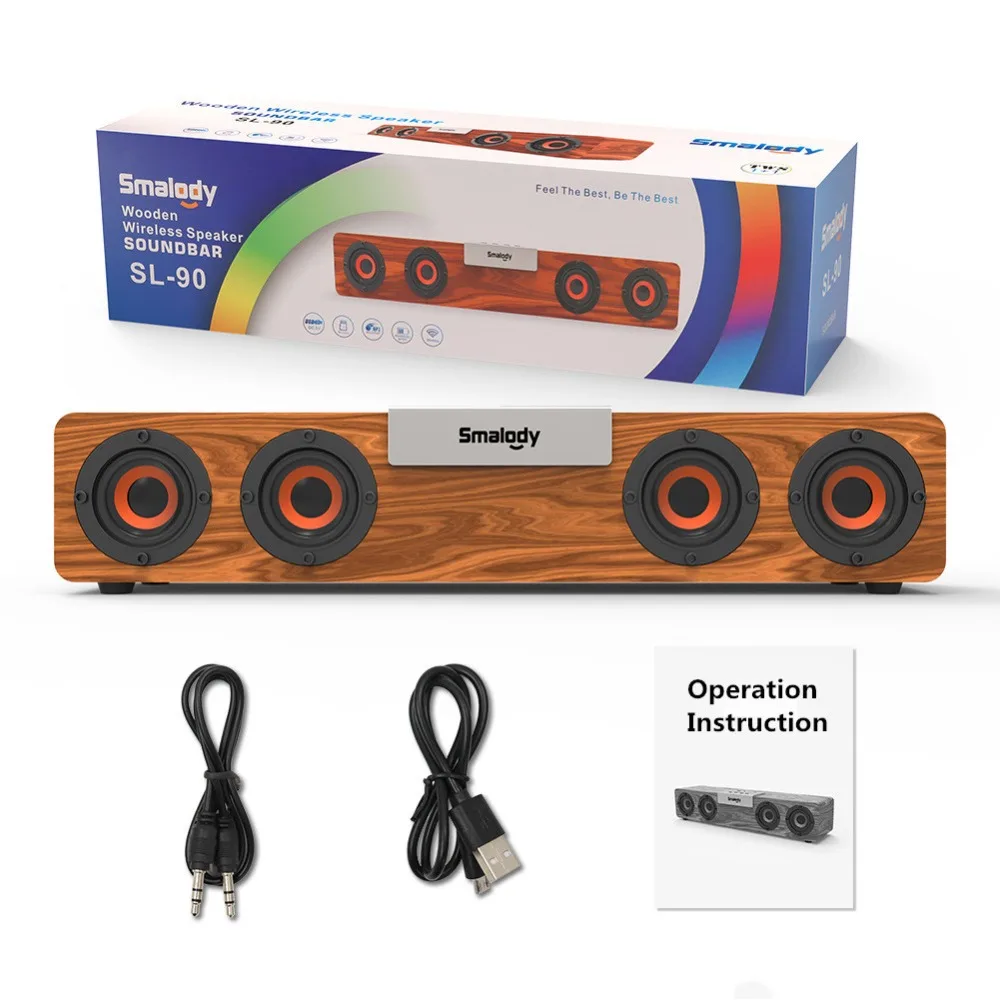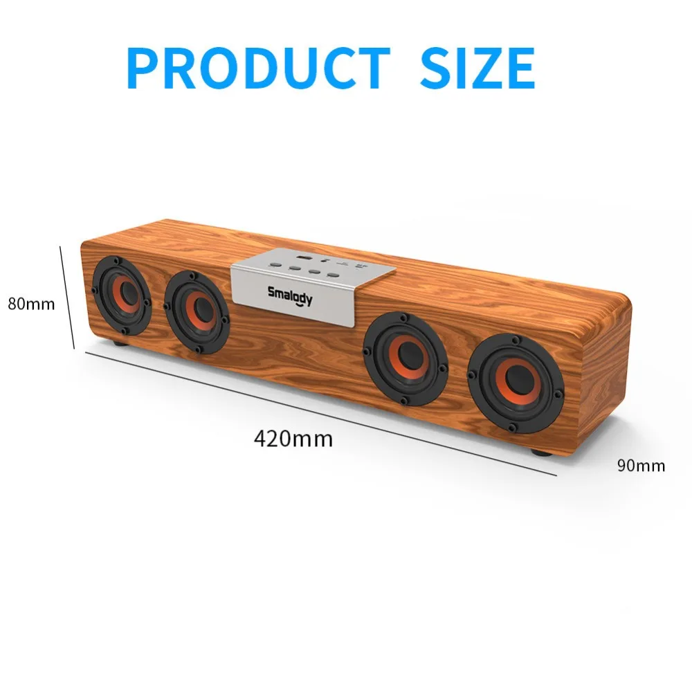 Особенности: Стерео естественный звук. Чип Bluetooth, чистый звук и идеальное качество, мощные басы и может наслаждаться неувядаемой стерео музыкой в любое время и в любом месте, когда вы находитесь вне дома. Мощный 20 Вт (5wx4) делает звук более энергичным и мощным басовым скачком. Элегантный Деревянный кубический дизайн. Деревянный чехол, элегантный кубический дизайн, идеально подходит для ПК телефона дома и улицы. Поддержка внешней TF-карты и FM-функции. Аккумулятор большой емкости 2400 мАч. Аккумулятор большой емкости для обеспечения более длительного времени прослушивания музыки. Энергосбережение, экологичность, отсутствие излучения. Зарядка 4 часа, проигрывание 8-10 часов. Bluetooth 5,0 уличная bluetooth-колонка, встроенная беспроводная передача bluetooth 5,0, рабочее расстояние до 10 метров. Встроенный микрофон высокой четкости, музыка автоматически приостанавливается при поступлении вызова, нажмите кнопку вызова Войдите в режим громкоговорителя и начните говорить. С TWS ONE с двумя функциями: Поддержка одного телефона подключается к двум динамикам одновременно, позволяет наслаждаться двойным звучанием, если у вас есть два динамика. Спецификация: Материал изделия: дерево Беспроводное подключение по Bluetooth 5,0, поддержка TWS 1 с 2 функциями Время воспроизведения: около 4-6 часов (зависит от условий громкости) Выходная мощность: 20 Вт Динамик: 52 мм Время зарядки: 4-5 часов Напряжение зарядки: 5 В/1 А-2 А Диапазон подключения: 33 фута Спецификация динамика: 2 "* 4/4Ω 20 Вт Рабочая частота: 200 Гц-20 кГц Аккумулятор: встроенный перезаряжаемый литий-ионный аккумулятор 3,7 в 2400 мАч Вес брутто: около 1400 г Размеры: 500*80*80 мм Отношение сигнал-шум: ≥ 80 дБ Функции: поддержка подключения Bluetooth 5,0, TWS, слот для карт TF, слот USB, FM-радио. Комплектация: 1 * Smalody деревянный динамик 1 * кабель для зарядки 1 * Руководство пользователя 1 * Розничная коробка