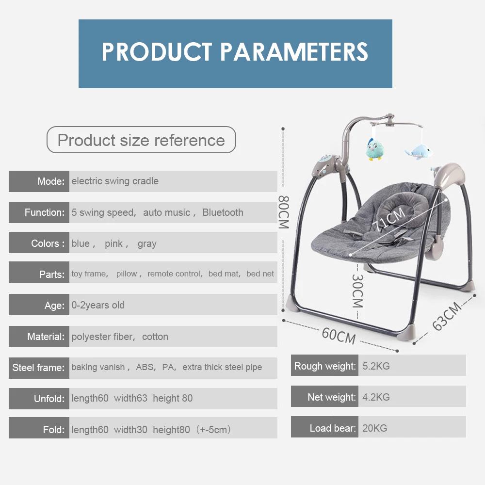 Продукт включает: 1. Электрическая качающаяся люлька x1 2. Подвесные игрушки x3 3. Москитная сетка x1