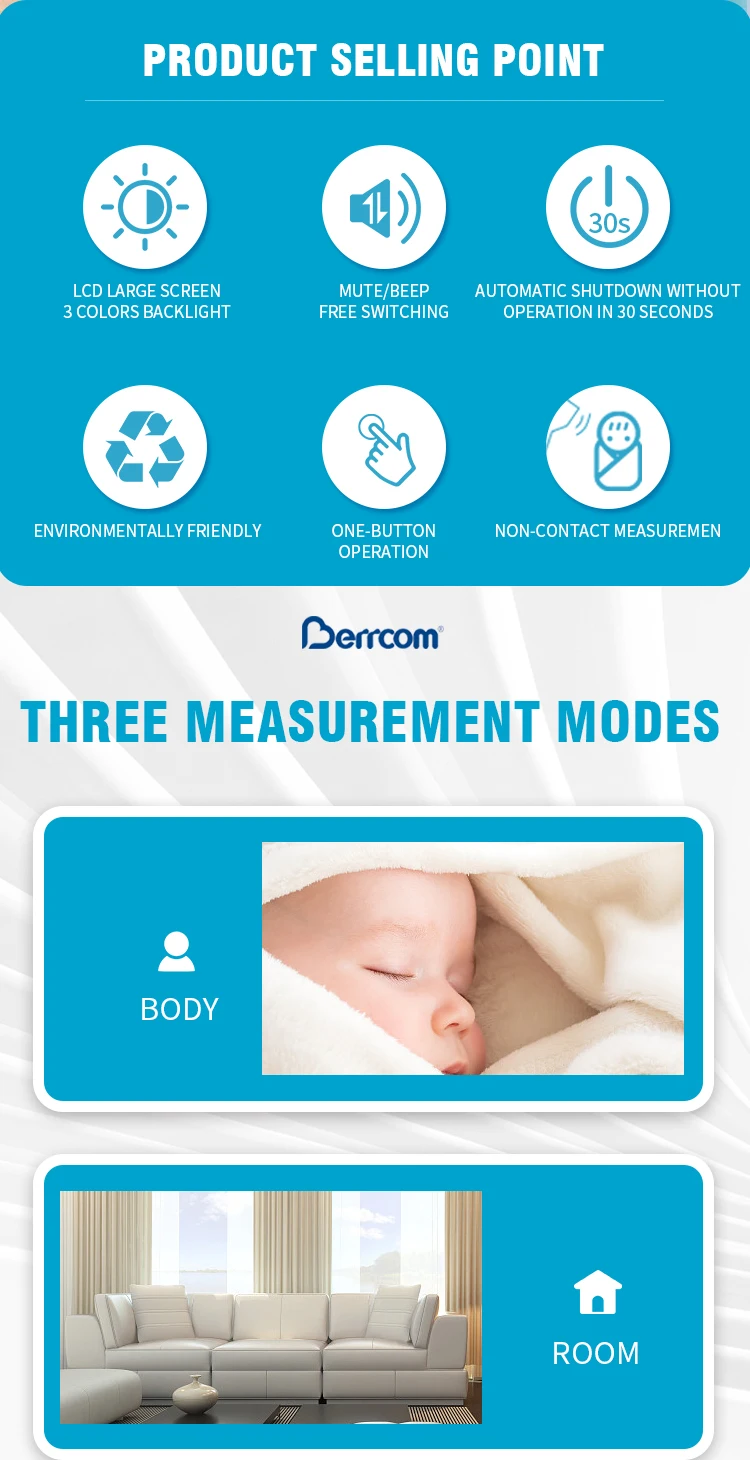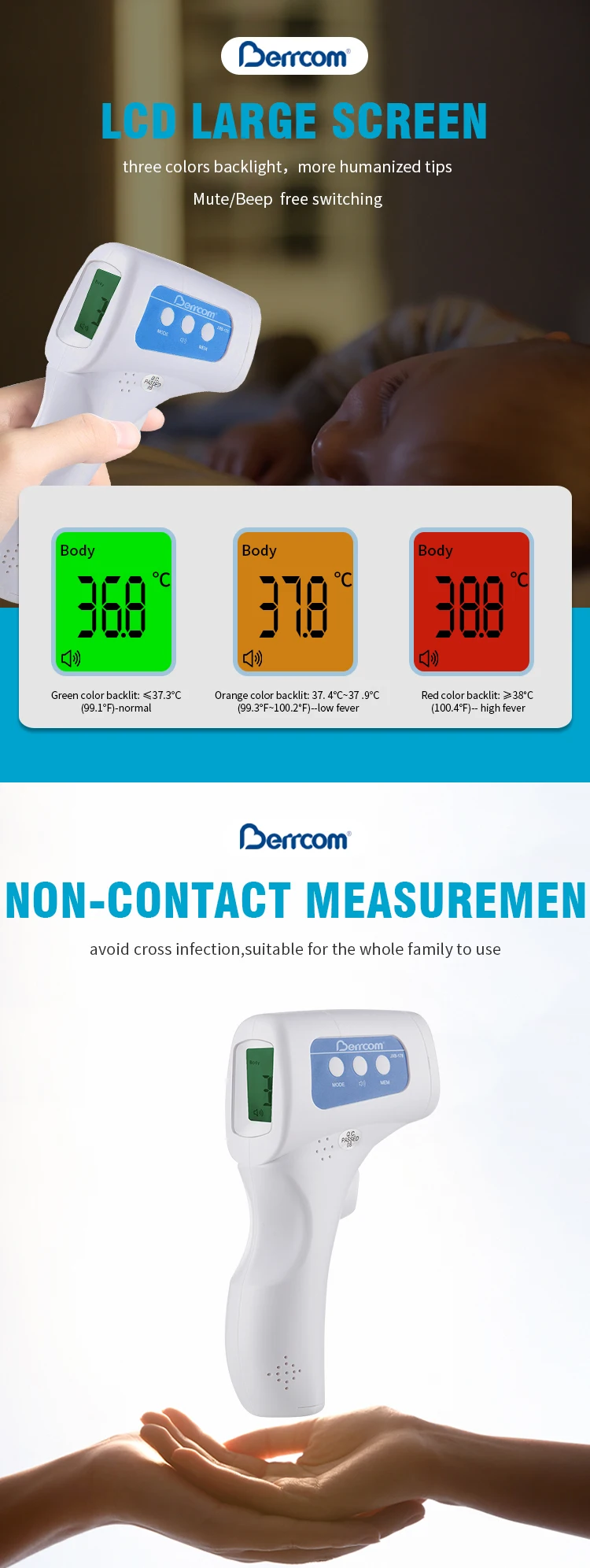 Особенности: 1. Время измерения: 1 секунда 2. Одно ключевое измерение 3. Измерение лба, отсутствие контакта с кожей 4. Большой ЖК-экран, 3 цвета подсветки 5. Сигнал тревоги при превышении заданной температуры 6. Три режима: поверхность, тело человека или комната 7. Единицы измерения: выбор °F или °C 8. Три языка: английский, французский, испанский 9. Поддержка функции автоматического отключения 10. Длительный срок службы: 100000 раз