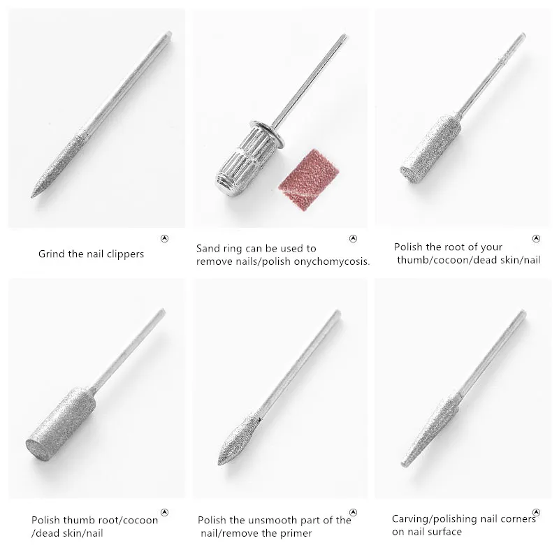 1.100% Абсолютно Новый в розничной упаковке 2,6 шт. ногтя сверла с 3/32 "хвостовик размер, подходит для большинства профессиональный электрический аппарат-дрель. 3. Прочная замена. 4. Используется для очистки краев ногтей/формирования краев/поверхности акриловых ногтей и гелевых ногтей. 5. Удаляет излишки клея и материала с нижней стороны акриловых/гелевых ногтей. Функция 1. Иглообразная шлифовальная Игла: используется для резьбы ногтей и шлифования углов ногтей. 2. Цилиндрическая шлифовальная Игла: используется для полировки и удаления ногтей с поверхности ногтей. 3. Конусная шлифовальная Игла: используется для полировки краев ногтей. 4. Цилиндрическая шлифовальная игла (маленькая): используется для измельчения маленьких ногтей, полировки корней ногтей, удаления мокроты, удаления омертвевшей кожи, удаления ногтей и т. д. 5. Цилиндрическая шлифовальная игла (большой размер): используется для измельчения больших ногтей, полировки корней ногтей, удаления мокроты, удаления омертвевшей кожи, удаления ногтей и т. д. 6. Набор песчаных колец: песочное кольцо должно быть вставлено в стержень для использования.