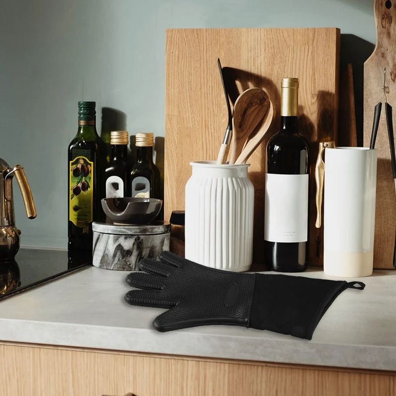 Супер сцепление: пятипальцевая конструкция дает вам большую гибкость при хранении горячих горшков, еды или стеллажей; Силикон на перчатке гарантирует, что вы обрабатываете широкий спектр предметов, не опасаясь их падения.