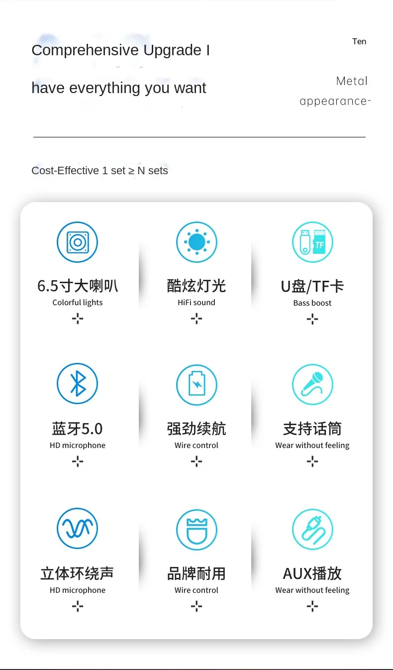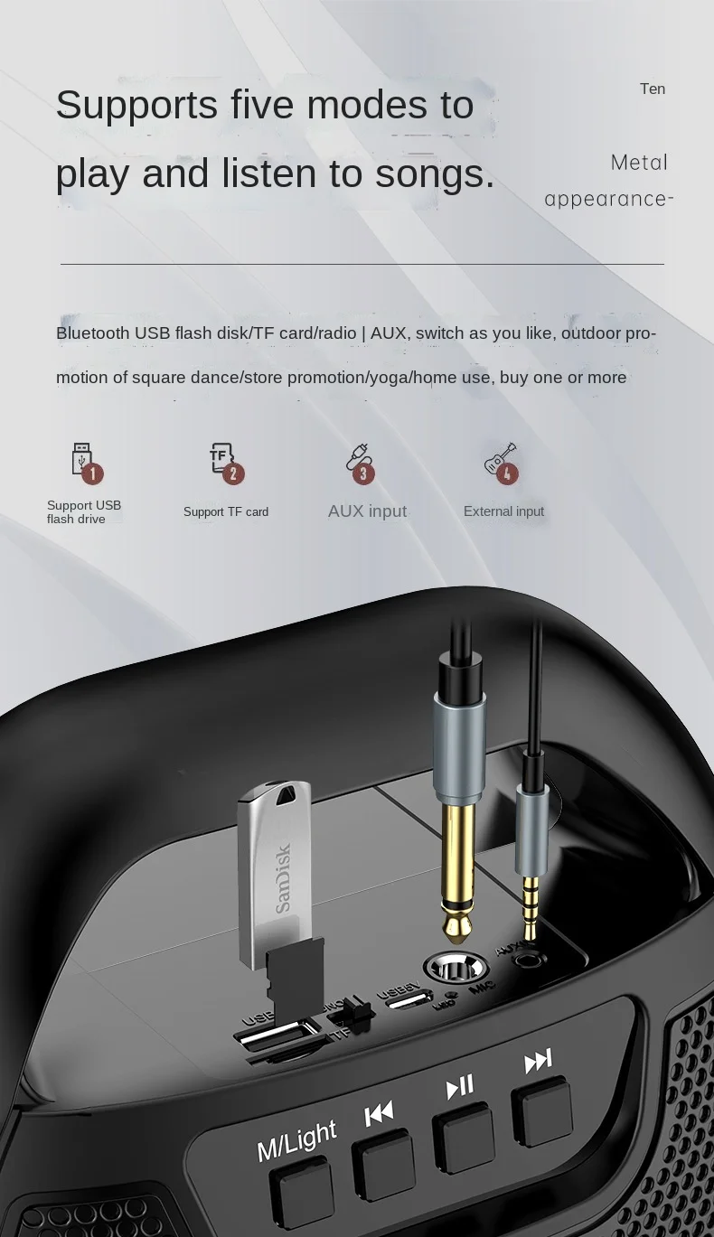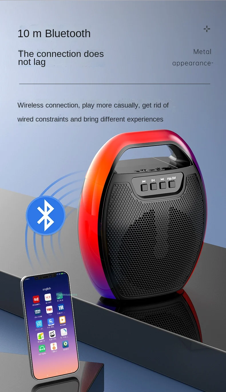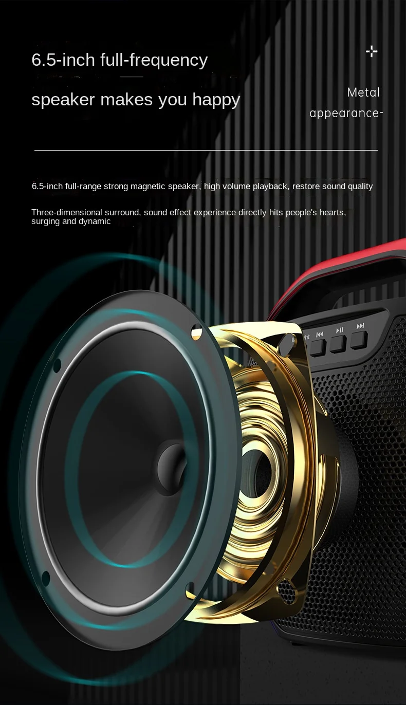 Объемный Звук 360 °, качество звука без шума, поддержка проводного ввода микрофона, подключение микрофона в любое время, чтобы спеть Bluetooth 5,0, расстояние до 10 м, можно подключить к мобильным телефонам, планшету, встроенный компьютер или ноутбук, функция fm-радио, прослушивание популярного музыкального радио, простота в эксплуатации, емкость батареи 1500 мАч, 10 часов новой любви для непрерывного воспроизведения, выносливости и сильной