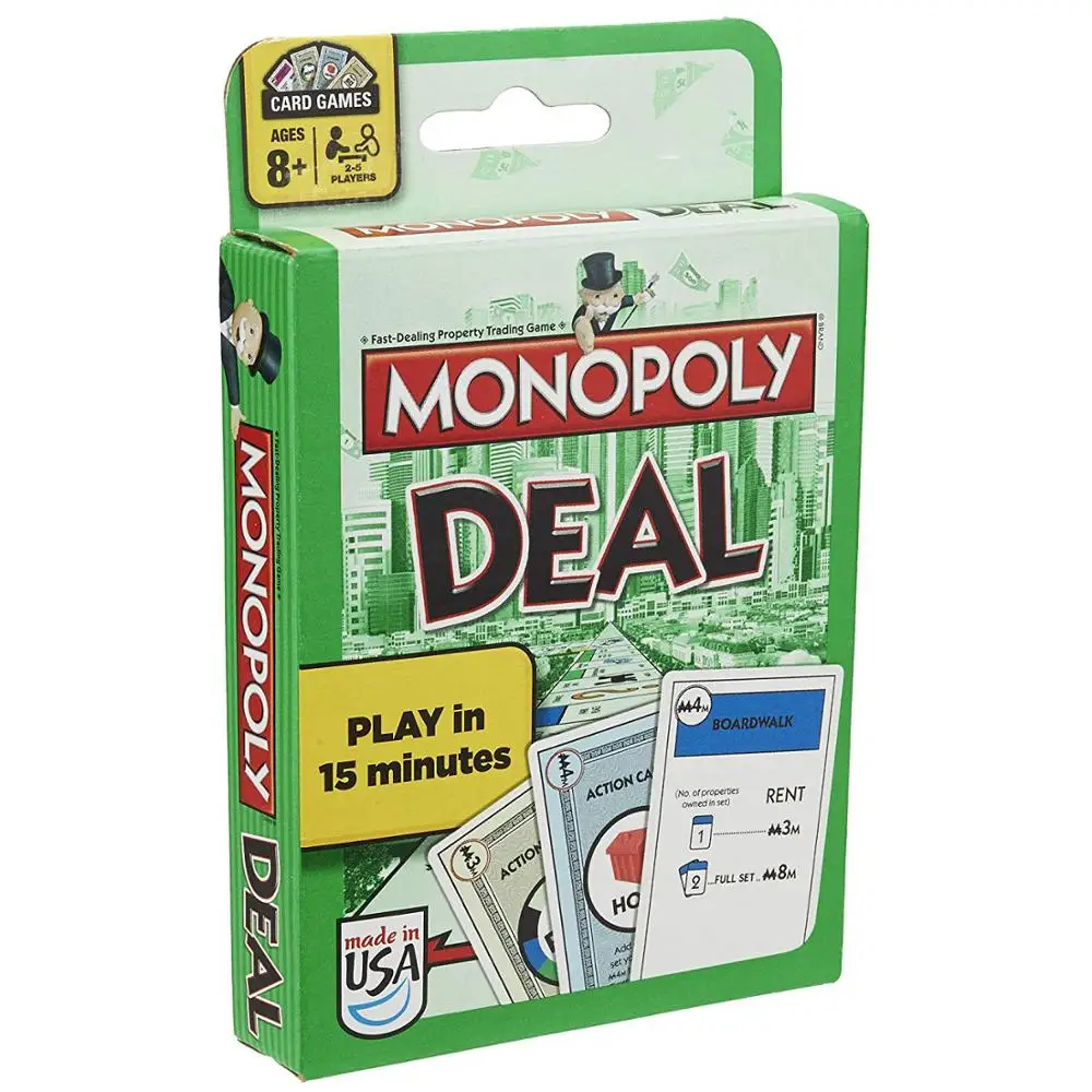 Новая карточная игра Monopoly Deal, которая проходит через Семейные игровые ночи, везде собирает 3 полных набора, но остерегайтесь коллекционеров долговых платежей, принудительные сделки и выключатели сделок, если вы ищете веселую игру для семьи/друзей, это сейчас только играет до пяти игроков, что занимает apprx 45 мин, чтобы играть с 5 людьми, Apprx 35 мин w/4, apprx 15-25 минут w/3 человека и apprx 5-15 минут w/2 человек весело, быстрая работа... каждая карта отсчитывается