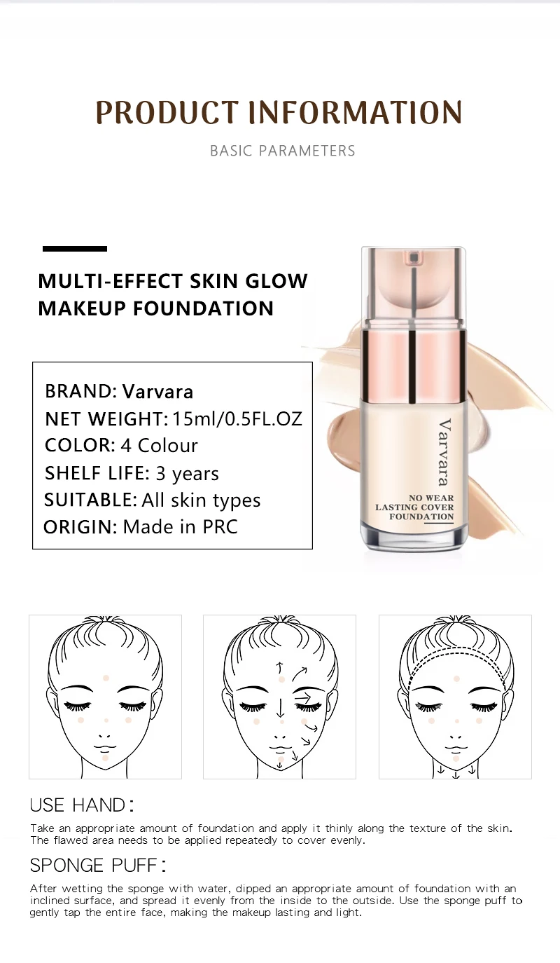Название продукта: многоэффектный Сияющий макияж для кожи Бренд: Варвары Реклама: не Износостойкий чехол Чистый влажный: 15 мл/0,5 фл. Oz e Описание: Роскошная основа повышает эластичность для более упругой кожи. И придает более гладкий, безупречный вид на коже. Помогает покрыть темные круги и темное пятно; Длительное покрытие, не легко отпасть; НЕВИДИМЫЙ жидкий консилер дает вам легкий и безупречный вид в течение всего дня. Подходит: все типы кожи Использование рук: Возьмите необходимое количество тонального крема и нанесите его тонко вдоль текстуры кожи. Дефектные области должны быть применены повторно, чтобы покрыть равномерно. Спонж: После смачивания губки водой смочите необходимое количество основы наклонной поверхностью и равномерно распределите ее изнутри и снаружи. Используйте губку, чтобы аккуратно коснуться всего лица, делая стойкий макияж и светильник. Примечание: Если во время использования возникает дискомфорт кожи, немедленно прекратите ее использование. Способ хранения: храните в прохладном проветриваемом месте, чтобы избежать прямых солнечных лучей.
