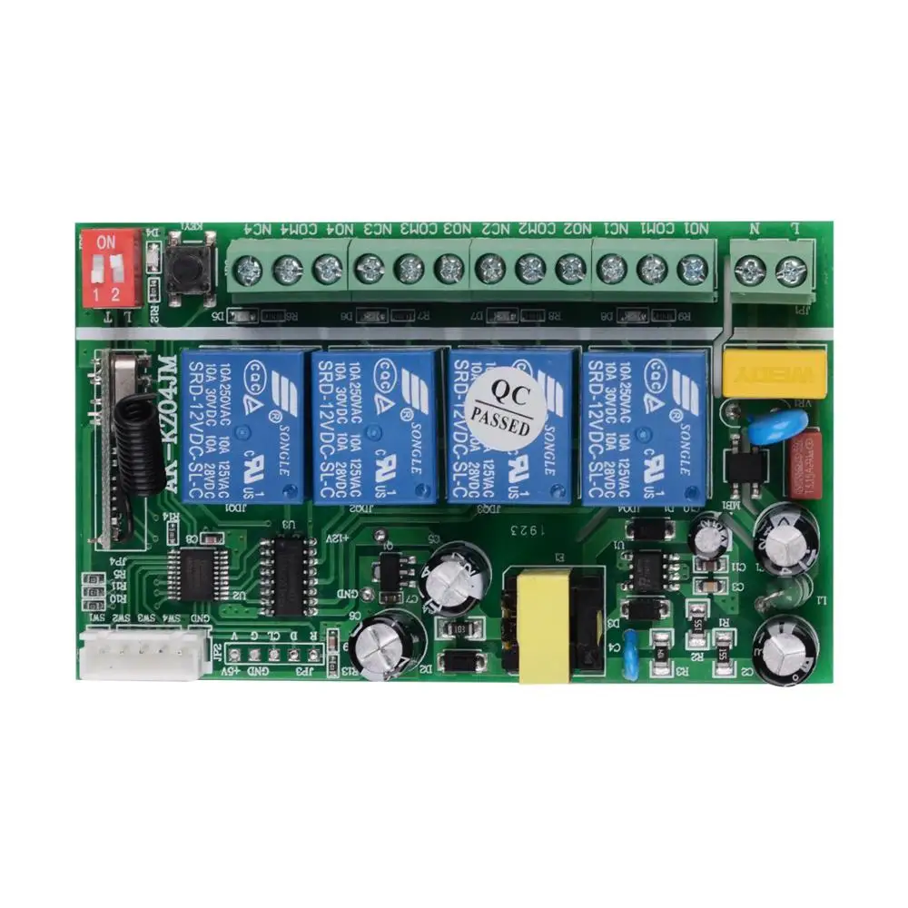 О приемнике: Номер модели: AK-KZ04JM 1. Рабочее напряжение: AC85-250V 2. Способ работы: RF + ручное управление 3. Рабочая температура: -40 градусов + 80 градусов 4. Чувствительность приемника: более-110 дБм 5. Рабочая частота: 433 МГц 6. Выходное напряжение: выход сигнала и вариант переменного тока 7. Выходной ток: менее 10 А 8. Максимальный ток нагрузки: 40A 9. Размер: 131x67x25 мм О способе работы: Рабочий путь изменен DIP-переключателем Мгновенный: по умолчанию 1,2 позиции Реле: Нажмите и удерживайте-> On; Release -> Off. Переключение: 1 на положение, 2 позиции по умолчанию Реле: Нажмите-> ВКЛ; Нажмите одну и ту же кнопку снова-> ВЫКЛ · Блокировка: 2 на положении, 1 позиция по умолчанию Реле: Нажмите-> ВКЛ; Нажмите другую кнопку-> ВЫКЛ. О способе обучения и очистки: Обучение: Нажмите кнопку обучения, индикатор мигает 1 раз, ослабляет палец, нажмите любую кнопку дистанционного передатчика, индикатор мигает три раза, что означает, что обучение успешно. Очистка: удерживайте кнопку обучения около 5-8 секунд, индикатор мигает четыре раза, это означает, что код очистки успешен. О передатчике: 1. Кнопки: 4 кнопки 2. Рабочее напряжение: DC12V 3. Рабочая частота: 433 МГц 4. Удаленное расстояние: 20-300 м 5. Рабочий ток: 13 мА · ч 6. Код: фиксированный код/код EV1527 7. Размер: 5,7x3,2x1,1 см