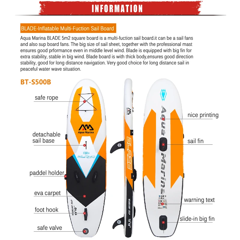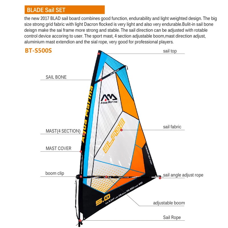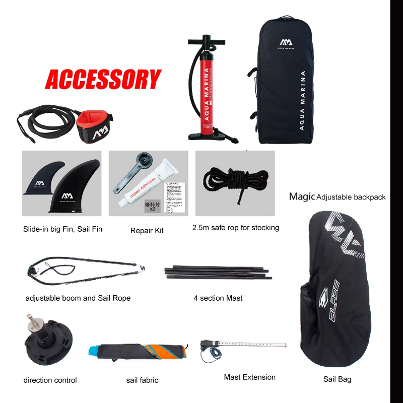 Размер паруса: 5 m2 лавсан, X-ply Sail с ПВХ-окном-светильник, прочный и устойчивый. 400 см 4 setction мачты Регулируемая штанга от 170 до 220 см, Регулируемый зажим с крышкой из ЭВА, бум с веревкой Высота паруса: 410 см Мачта: 13'2 "(400 см), набор из 4 шт мачты композитный RDM Другие компоненты буровой установки: Переносная сумка для хранения, универсальная сумка для хранения на молнии, которая вмещает мачту/бум/паруса в одном компактом, удобном в транспортировке корпусе Максимальная нагрузка: 150 кг, предположительный Вес: 100 кг или меньше Размер платы: 330*80*15 см Вес продукта: 20,5 кг Оригинальный комплект включает в себя: доску, парусины, сумки для переноски, насос для надувания, плавник