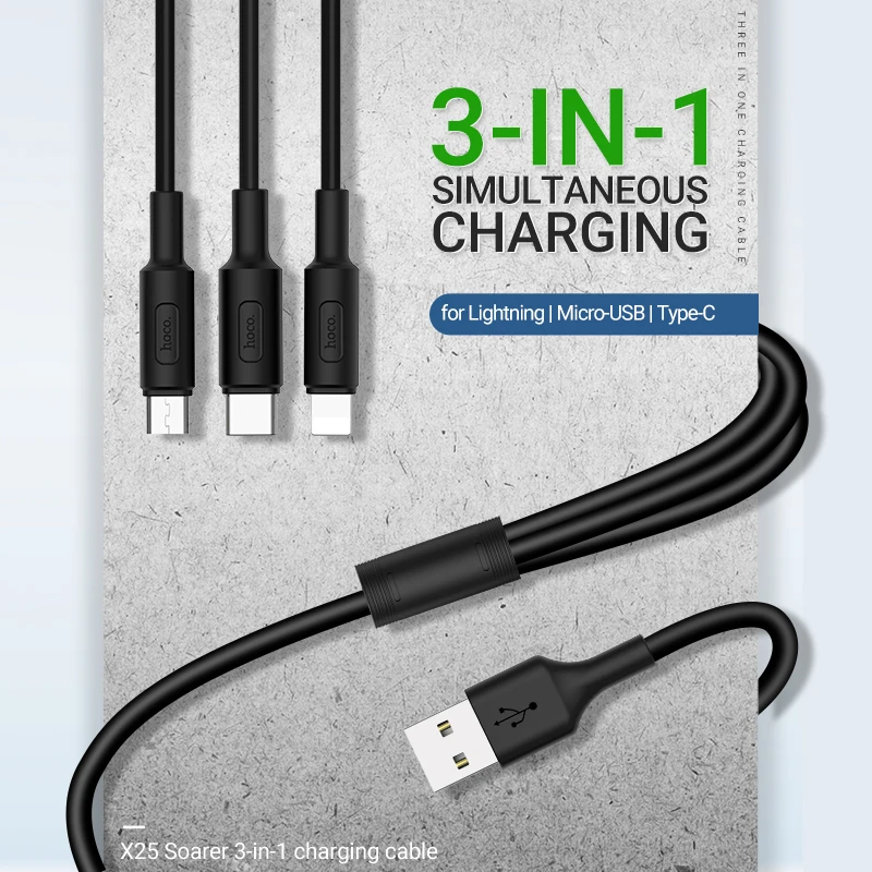 hoco. X25 Soarer 3 в 1 зарядный кабель для Lightning + Type-C + Micro USB ток до 2А длина 1м