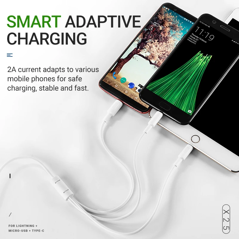 1. Длина 1м (основной кабель 0.8м + суб-кабель 0.2м). Вес 37 г. 2. Поддерживает зарядку для Apple телефонов и Android телефонов, максимальный ток около 2А. 3. Кабель PVC, черный и белый цвет по желанию. Удлиненное основание коннектора для обеспечения длительного срока службы, качественный и долговечный, стабильная зарядка. 4. НЕ поддерживает передачу данных.hoco. X25 Soarer кабель для зарядки и передачи данных для Lightning / Type-C / Micro-USB длина 1м ток до 2А
