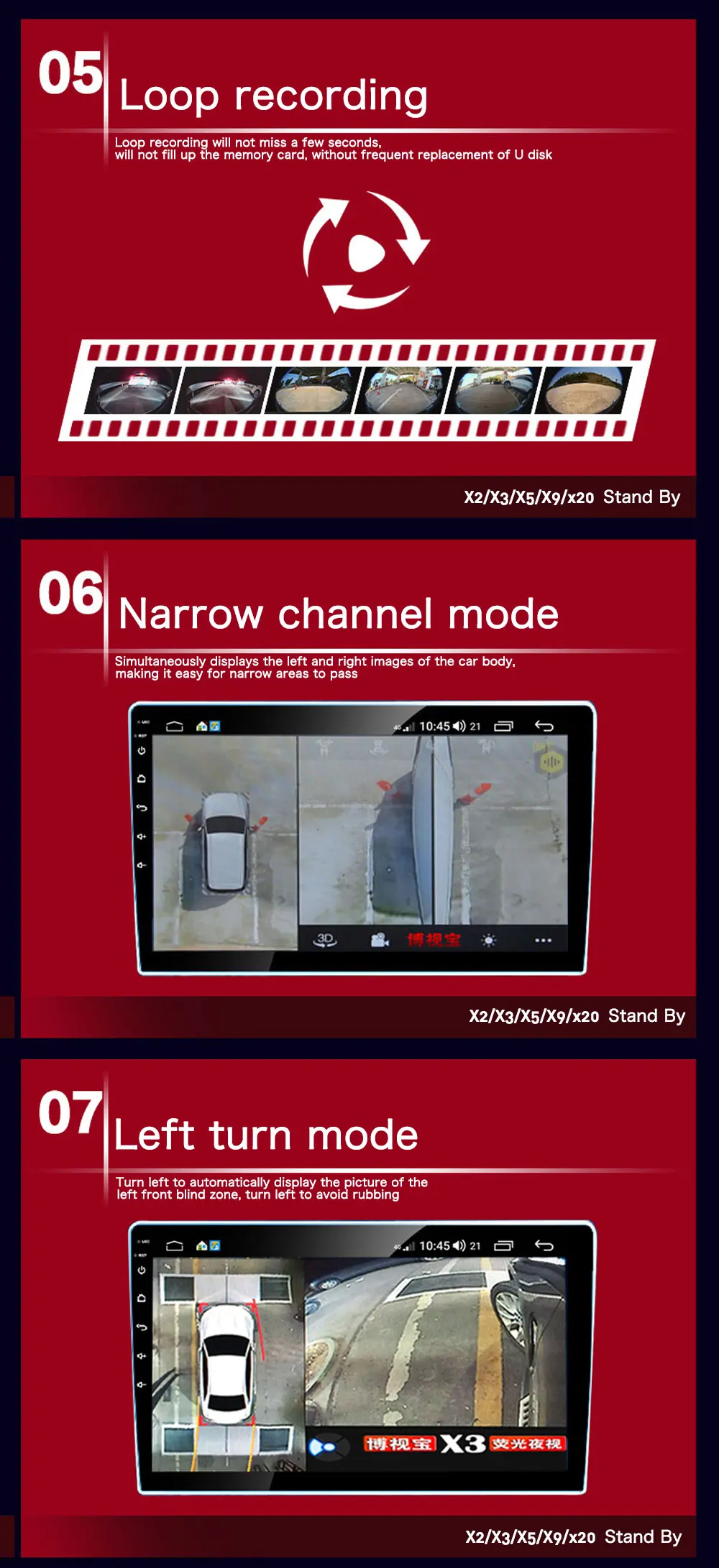 Название продукта: 360 панорамная система мониторинга вождения 1. Способ питания: оригинальная автомобильная Постоянная мощность + ACC 2. Номинальное напряжение: 12 В 3. Формат вывода: AV / VGA / AHD / USB 4. Процессор: Восьмиядерный процессор Hisilicon 5. Водонепроницаемый объектив: IP67 6. Хранение видео: u-диск (рекомендуется 8 ~ 32G) 7. Метод обновления: обновление u-диска 8. Панорамный диапазон: 3 ~ 4 метра 9. Длина из кабель-удлинитель: 4 метра в передней части/6 метров в задней части/3,5 метров в левые и правые Особенности продукта 1. Действительно бесшовная панорама на 360 °, большое поле зрения, всесторонний мониторинг, видео с временным интервалом 2. Профессиональная интеллектуальная функция отладки опционально (управление рулем/управление видео) 3. Мониторинг парковки после парковки, вы можете выбрать, чтобы продолжить запись функция времени является необязательным 4. U-диск расширенного хранения видео рекомендуется 8 ~ 32G 5. Узкий режим дороги, левый и правый изображения отображаются одновременно 6. Изменение траектории заднего хода с рулевым колесом, направляя путь заднего хода и задним ходом быстро Состав продукта 1. Хост продукта 2. Четыре широкоугольных камеры 3. Камера разделена на четыре линии 4. Удлинитель камеры 5. Пульт дистанционного управления 6. Приемник дистанционного управления 7.AV шнур питания/VGA шнур питания 8. Кольцо с углом обзора камеры 9. Сверла (Примечание: X5 и X9 оснащены Android большой экран навигации, пожалуйста, сделайте заказ в соответствии с размером в центральная консоль вашей модели (9 дюймов и 10,2-дюймовым экраном)