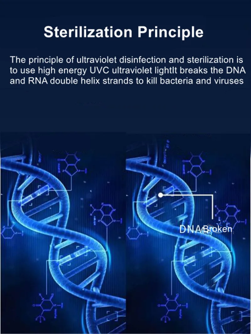 Принцип ультрафиолетовой дезинфекции и стерилизации Для использования высокой энергии UVC ультрафиолет разбивает DNA И RNA двойные спиральные нити для уничтожения бактерий и вирусов.