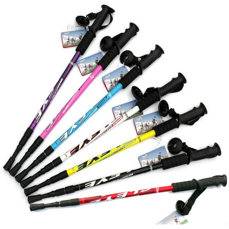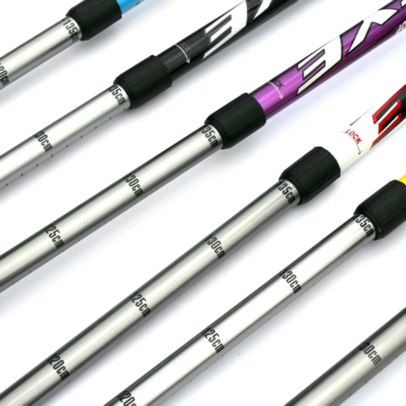 Each one is equipped with: elevator, mud support, foot cover. Rod material: high strength 6061 aviation aluminum alloy Handle material: rubber handle Shock absorber: yes Telescopic length: 135 / 65cm Number of sections / diameter: 3 sections / 18/16 / 14mm Wrist strap: nylon wrist strap Net weight: 300g Color: pink, blue, black, white, yellow, purple, red