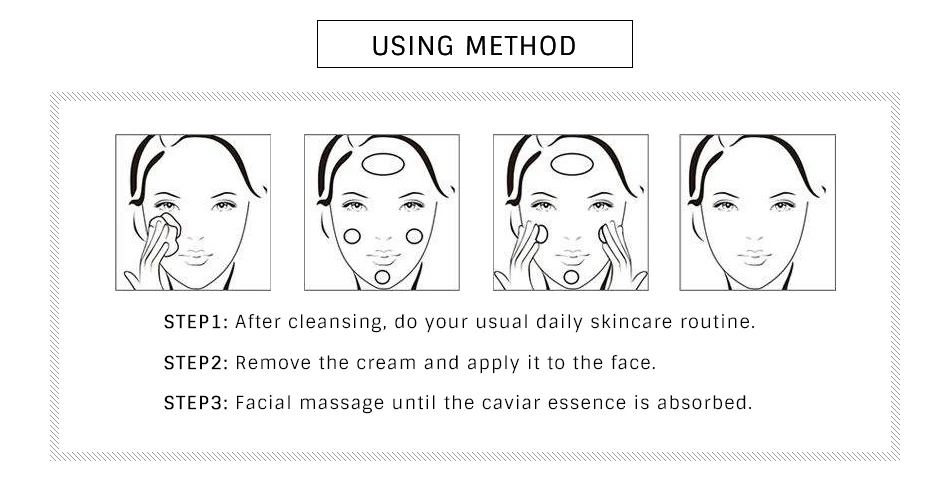 Using method : Step 1 :After cleansing, do your usual daily skincare routine Step 2 remove the cream and apply it to the face Step 3:Facial massage until the caviar essence is absorbed
