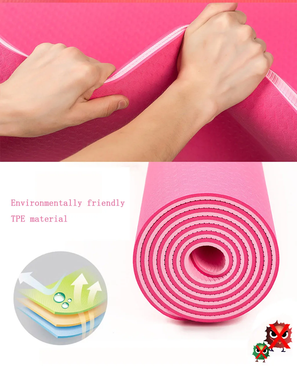 Экологически чистый материал-ТПЭ является новейшим технологическим усовершенствованием для традиционных Ковриков Для Йоги. Без латекса, без ПВХ, нетоксичных или любых вредных химических веществ. Получите Здоровый Коврик для йоги для себя.