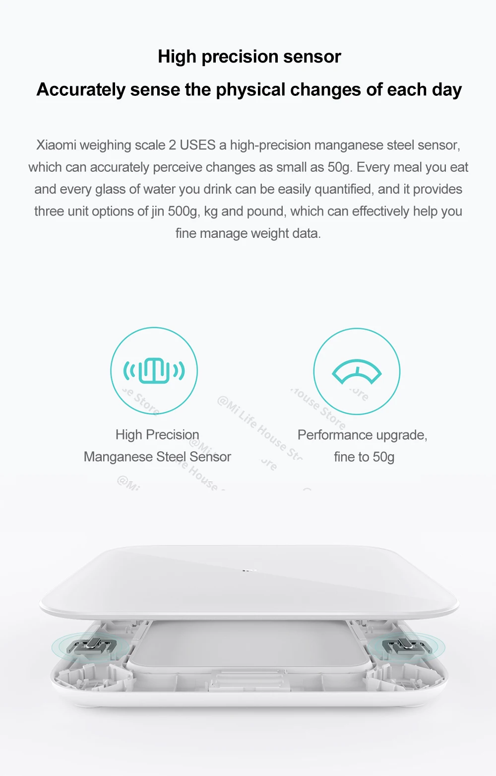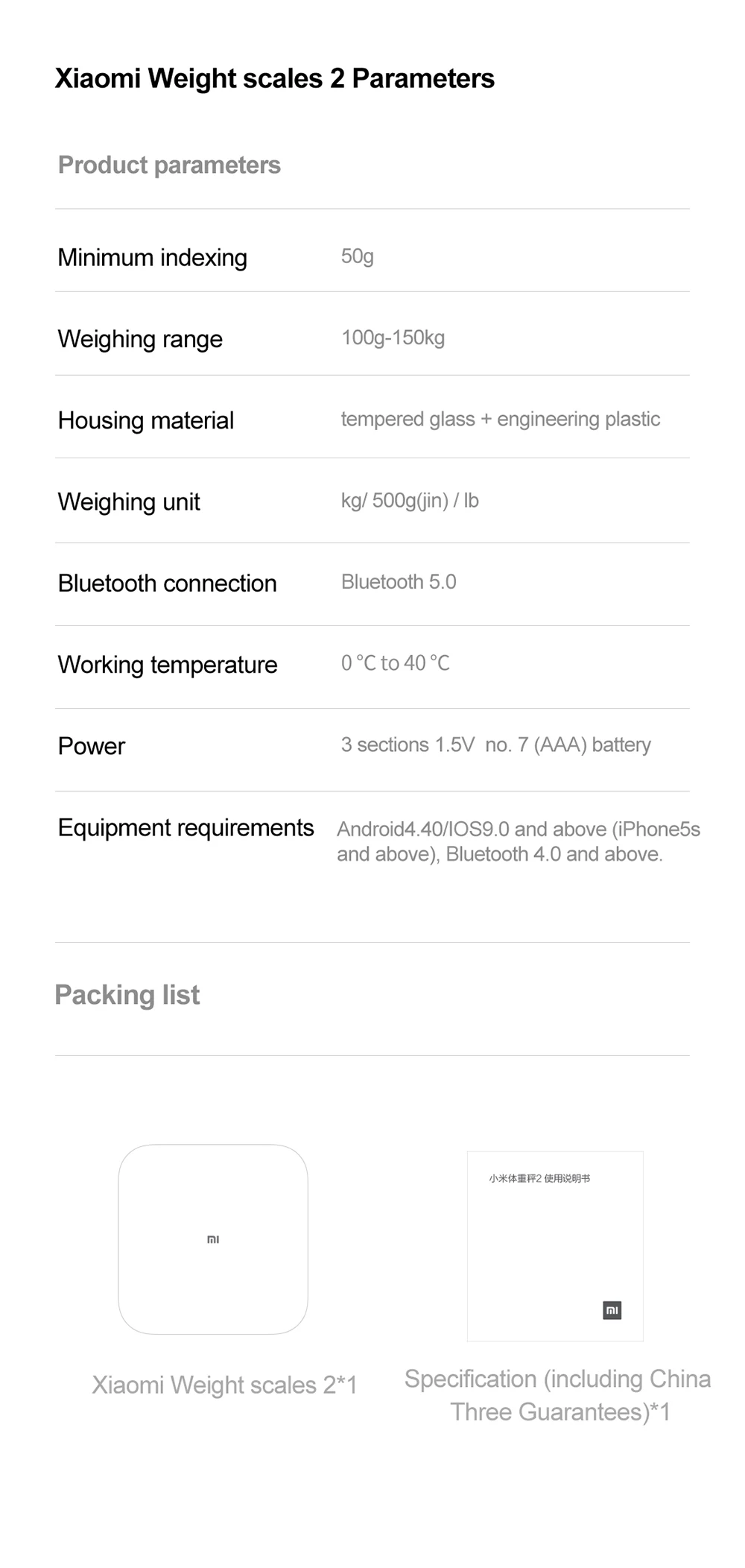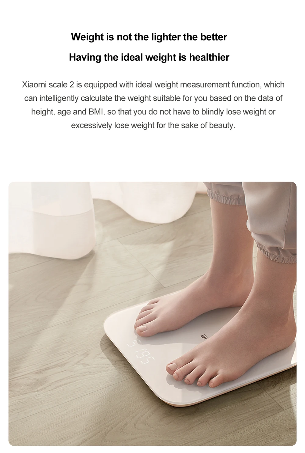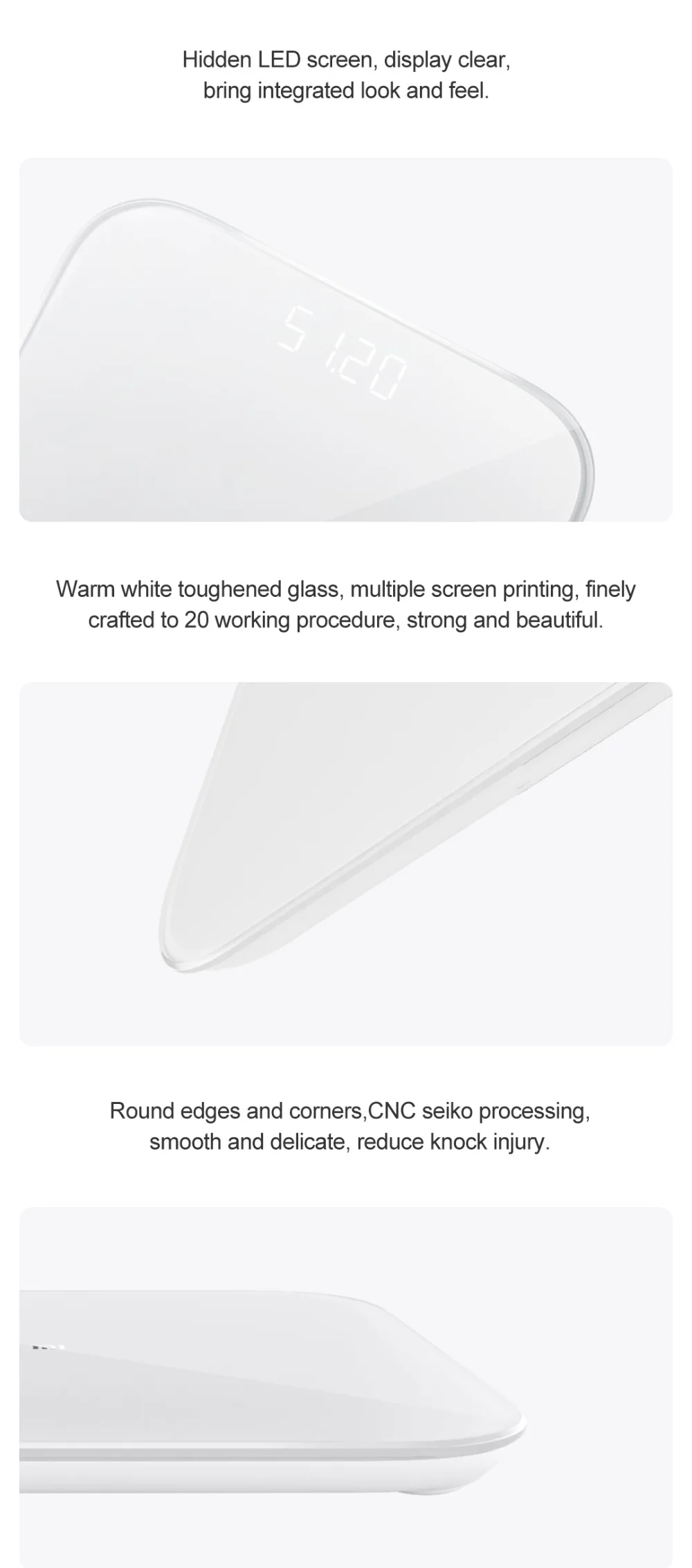 • Высокоточные датчики могут точно ощущать изменения вашего тела каждый день. • Приложение Xiaomi sports может просматривать данные в любое время и в любом месте и записывать изменения веса. • Через данные BMI (Индекс Массы Тела), предоставленные приложением, вы можете сделать фитнес-план или корректировку диеты. • В дополнение к весу, он может измерить по крайней мере 100 г предметов, которые могут удовлетворить потребности взвешивания мелких предметов. • Скрытый светодиодный экран, четкий дисплей. • Теплое белое закаленное стекло, благодаря 20 процессам, прочное и красивое. • Круглый угол, с ЧПУ точной обработки, уменьшить ущерб, вызванный ударом в него. • Bluetooth 5,0, более быстрая и стабильная передача весовых данных.