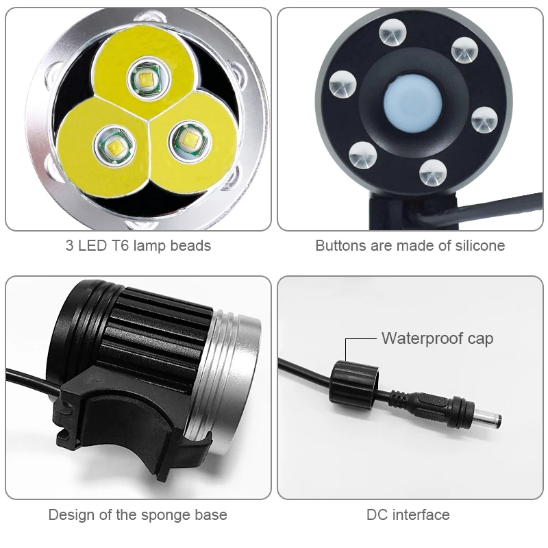 Характеристики:Тип светодиодный: XML-T6 светодиодныйСветодиодный индикатор: 3 шт.Светодиодный Цвет: белыйМатериал: алюминиевый сплавОбъектив: стеклянный объектив с покрытиемСветильник: как на изображенииДальность действия: 200 метровИзделие напряжение: 8,4 VВход питания: 7-12 ВДисплей питания: зеленый светильник включен, мощность достаточно, красный светильник горит, мощность слаба4 режима: один светильник/двойной светильник/три светильник/вспышкаИсточник питания: 6400 мАч или 9600 мАч 18650 аккумуляторВодонепроницаемость: IPX4 (не для дайвинга)Высокопроизводительный электронный переключатель: S светильник ly нажмите переключатель, чтобы включить/выключить светильникПрименение: Может использоваться как налобный фонарь или велосипедный светильник