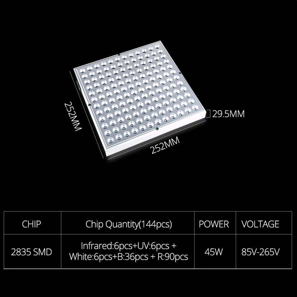 Особенности:1. Светильник выращивания был разработан с полным спектром (90Red + 36Blue + 6White + 6UV + 6IR), дает идеальную длину волны для всех растущих сцен. Подходит для посева, прорастания, вегетативного и цветения.