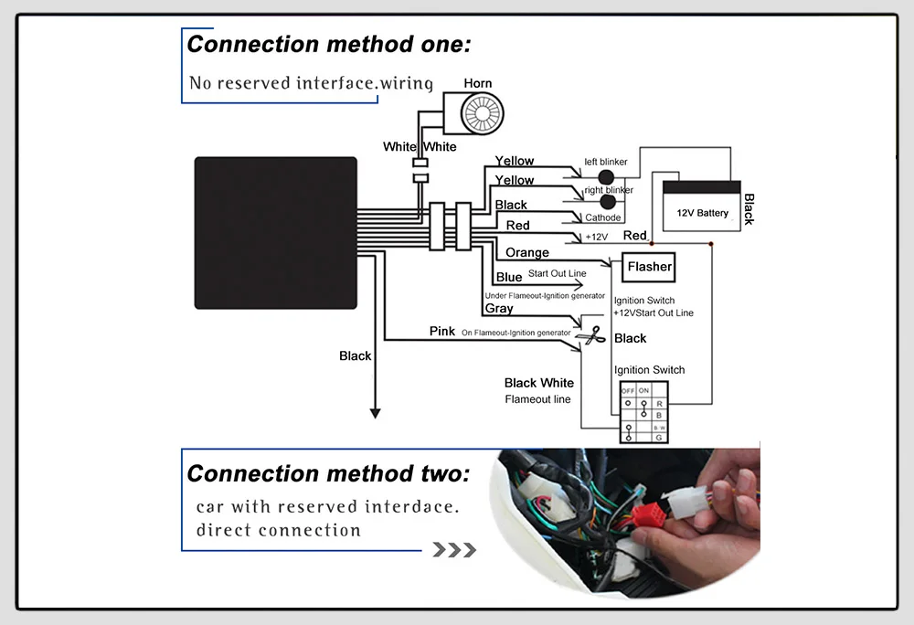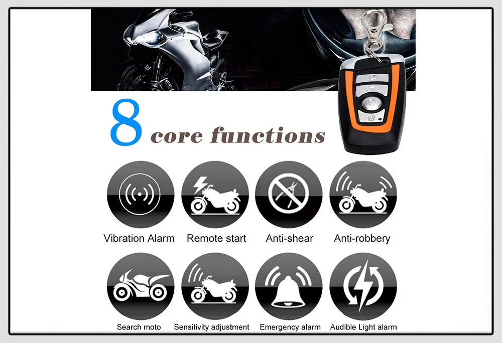 - Это система охранной сигнализации для мотоциклов, одноцветный двухцветный пульт дистанционного управления, звуковая сигнализация, не требует ключа для вождения, проста в установке и использовании.