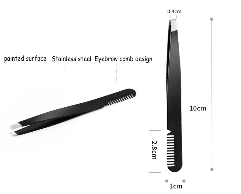 Название продукта: Профессиональный пинцет для удаления волос из нержавеющей стали с наклонным кончиком инструмент для макияжа бровей Материал: нержавеющая сталь Цвет: черный Размер: 10 см * 1 см Вес: 11 г Сделано в Китае Описание: дизайн гребня для бровей. 430 материал из нержавеющей стали, окрашенная поверхность, плотный укус, маленький и простой в обращении