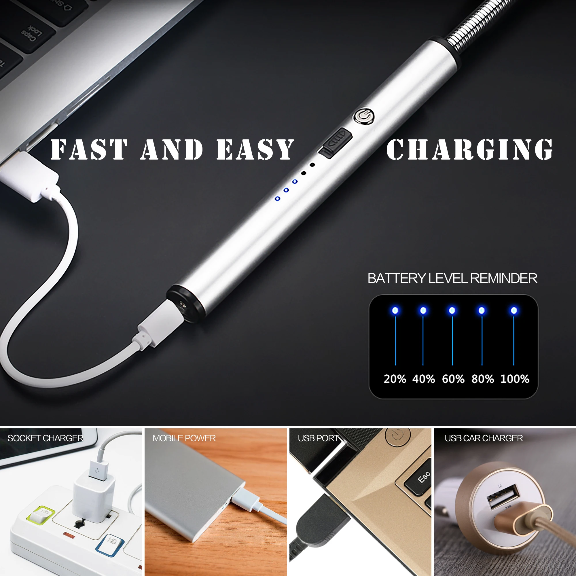 Мы используем легкую длинную шею с гибким внешним видом и легким размером, подходящим для ежедневного использования в помещении и на улице. Ветронепроницаемая и защищенная от брызг конструкция предотвращает рассеивание электрических импульсов при сильном ветре или влажной погоде. Дуговые зажигалки идеально подходят для освещения в плохую погоду.