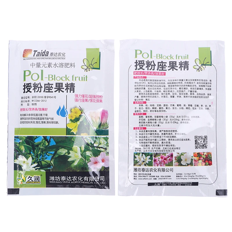 Фруктовые деревья, овощи и цветущие растения используют удобрения. При использовании в стадии цветения вы можете открыть больше цветов и вырасти больше фруктов. Он может решить проблемы опыления, падения цветов и фруктов, вызванные плохой погодой, такой как холодное охлаждение весной, засухой, непрерывной высокой температурой летом и непрерывной высокой температурой летом.