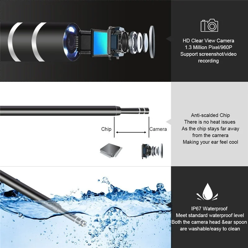 Ультра-маленький HD объектив, довольно легкий доступ к ушному каналу, вы можете видеть интерьер более четко и удобно.
