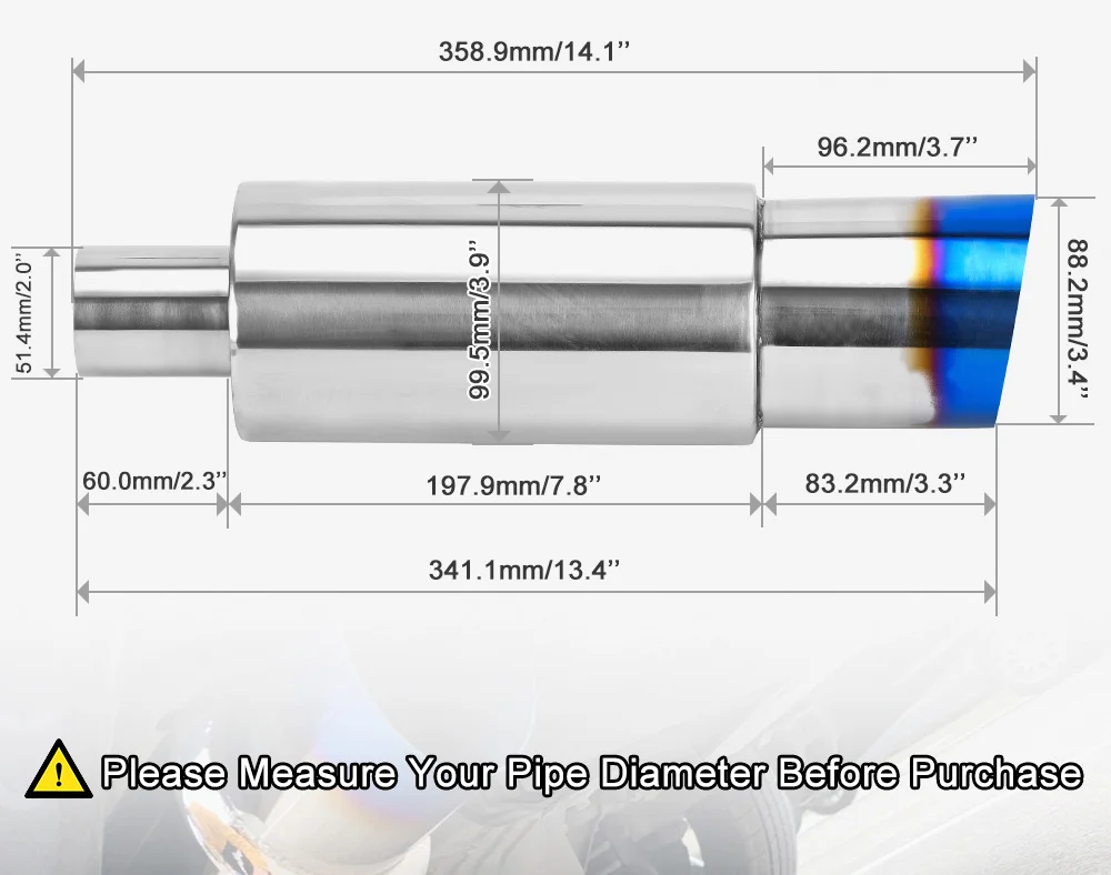 Размер: 2 дюйма на входе, 3,5 дюйма на выходе, 14,1 дюйма в длину.