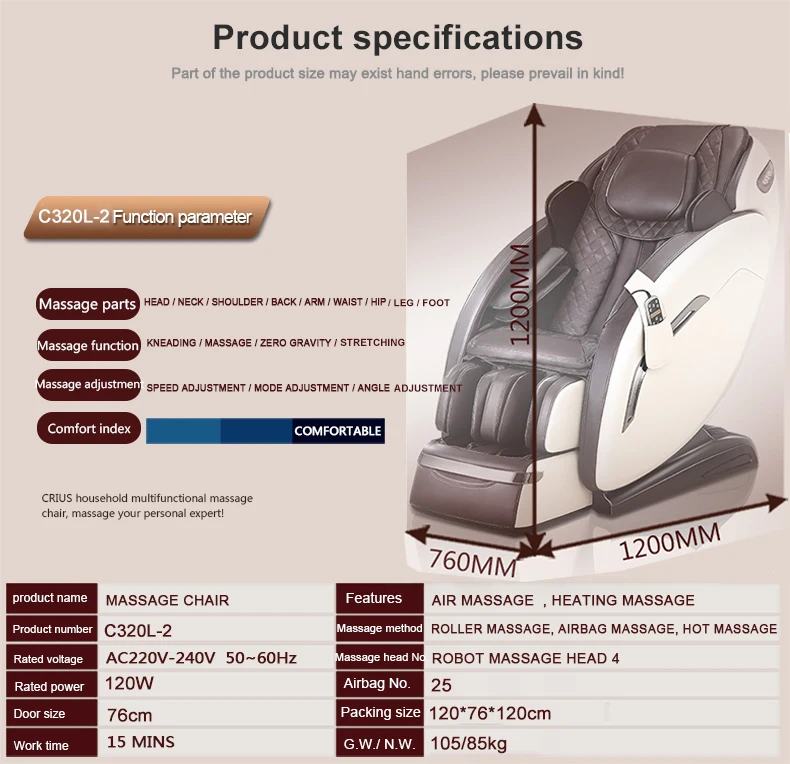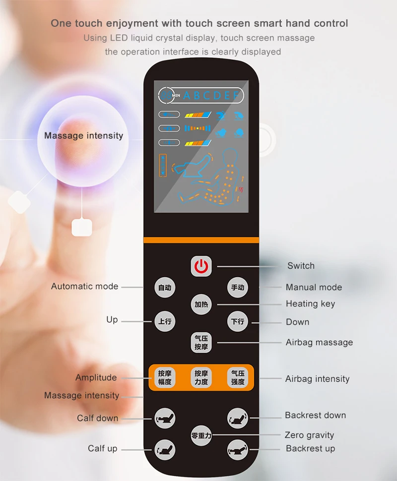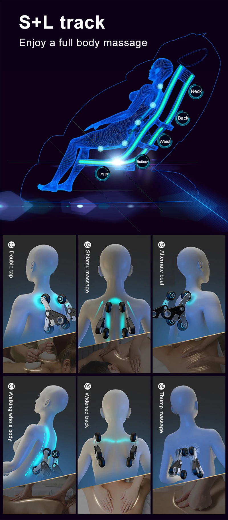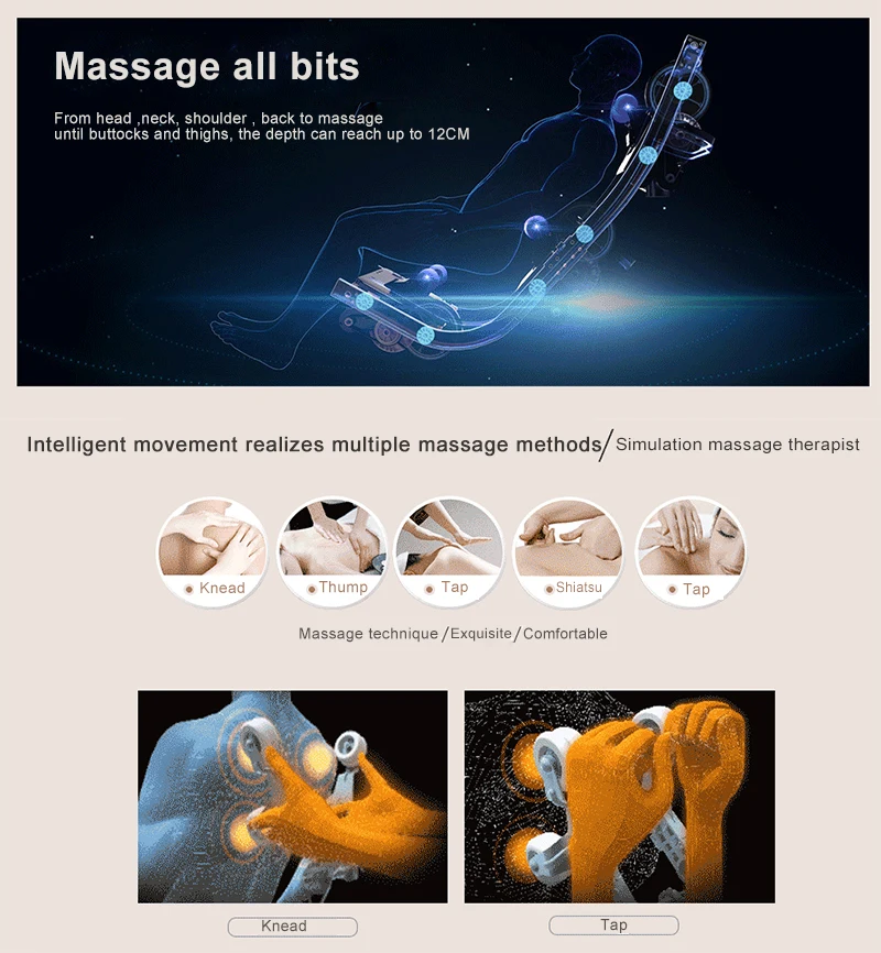 Функции: 1. Нулевое положение G/функция качания 2. Двойной SL форма трека механизм 3. Воздушные программы давления от головы и шеи до рук и подошвы. 4. Беспроводной Bluetooth аудио 5. Массажный ролик для ног 6. Подлокотник блокирует спинку 7. Функция подогрева 8. Растяжка для ступней массаж 9. Спинка и икры могут быть подняты и откидываются отдельно. 10. Шестироликовый мягкий манипулятор 11. Массажное кресло может вернуться в исходное положение при выключении питания.