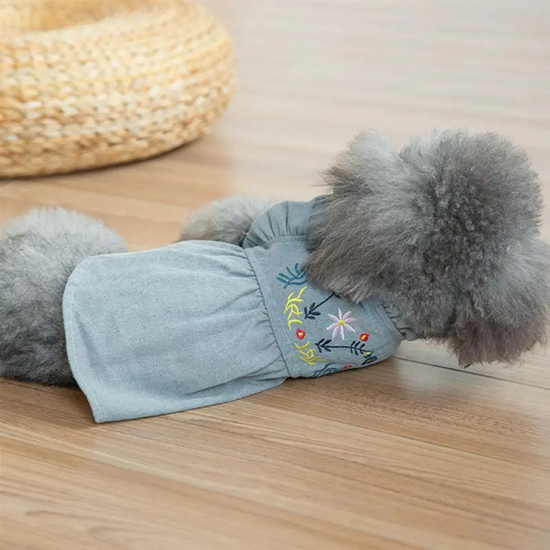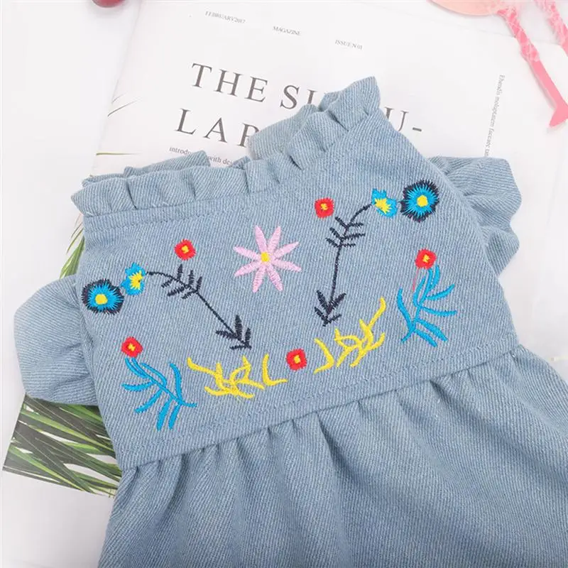 Это джинсовое платье-майка с вышивкой, которое изготовлено из высококачественного материала, износостойкое. Цветочное платье для собаки легко надеть и удобно для вашей маленькой собаки. Подходит для вечеринок, выступлений или фотосессий.