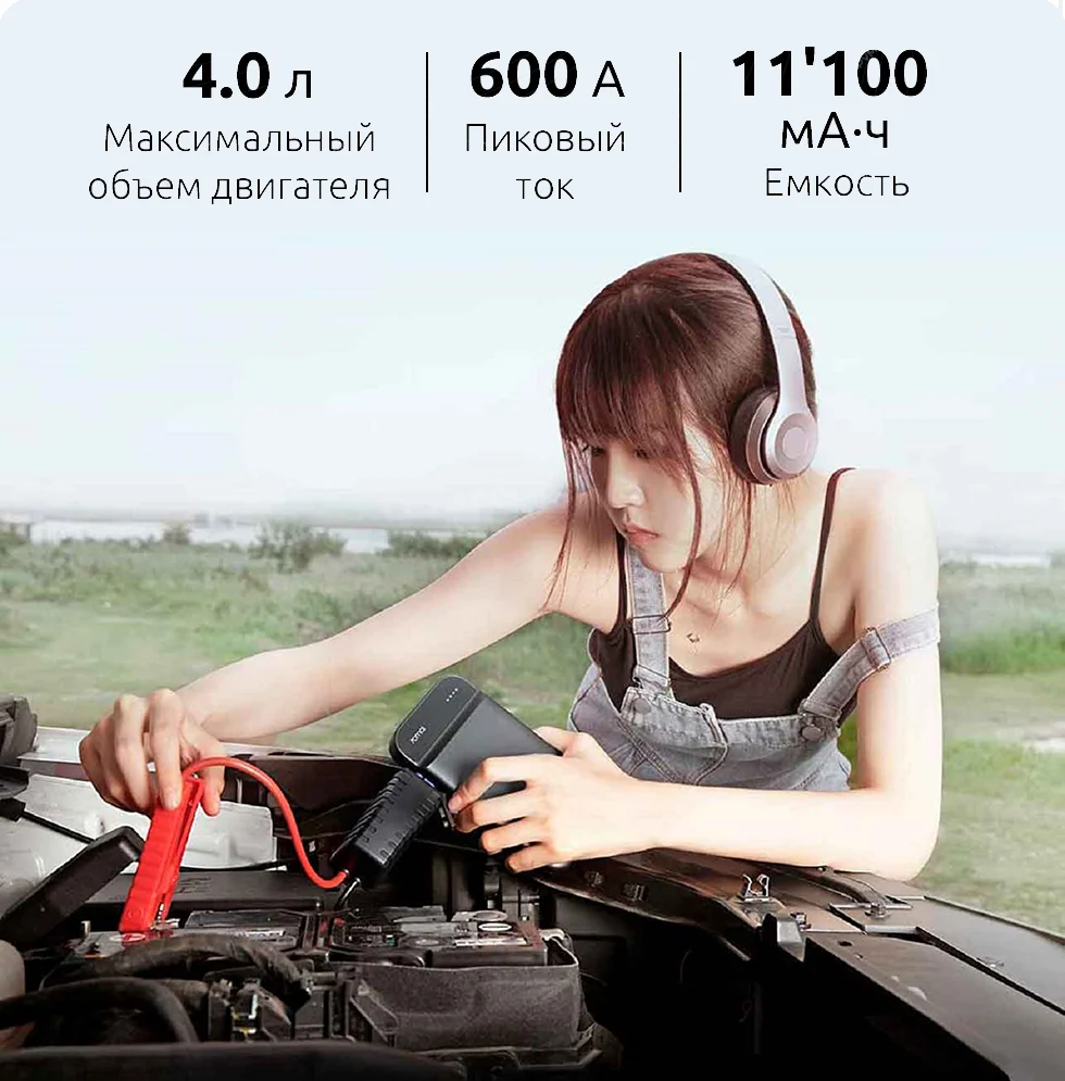 Пусковой ток аккумулятора 70Mai - 250 А, а пиковый - целых 600 А. С ним можно быстро оживить аккумулятор и запустить двигатель автомобиля. Благодаря емкости аккумулятора в 11100 мА·ч при полном заряде двигатель объемом 3.0 л можно запустить целых 40 раз, а двигатель объемом 4.0 л - 30 раз. С таким устройством Вам никогда не придется просить “прикурить”.