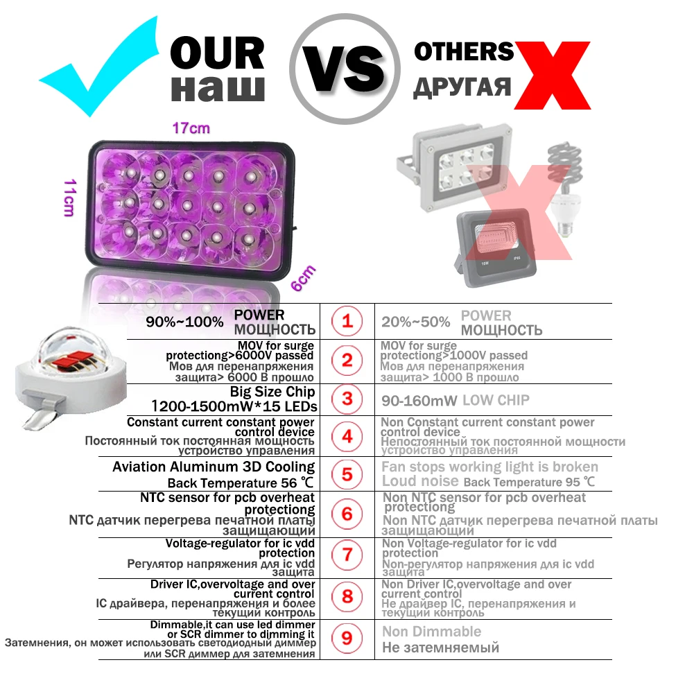 Бренд: Mr.Chen Сертификация: CCCC/ROHS/CE Входное напряжение: 110 ~ 240 В Средний срок службы (часов): 50000 Гарантия 5 лет: Wroking< 50 градусов Цельсия И <8 часов/день Запатентованный: см. Имитацию для легальной ответственности Производственный процесс: ISO9001:2015 Громоотвод для защиты от грозовых: 4KV Коэффициент мощности:> 0,95 Светодиодный чип: США Bridgelux Количество светодиодов: 1200 ~ 1500 мВт * 15 светодиодов Цветовая температура: УФ 405/395/385 нм Черный свет (395nm): 20 ~ 60 квадратных метров Отверждение (365 ~ 405 нм): чем ближе, тем лучше Угол рассеивания света: 15 градусов (снимается линза 90 ~ 120 градусов) Размер лампы: 17*11*6 см (0,6 кг) Способ подключения: свободный провод с глобальной вилкой 1,5 м Способ установки: ручной, подвесной, плоский Нагрев лампы: 53 градуса Цельсия после 24 часов Рабочая температура: -35 ~ + 50 Температура хранения: -35 ~ + 50 Фактическая мощность: Полная мощность Потребляемая мощность: 25 часов 1 кВт/ч Замена: 250 Вт ~ 500 Вт HPS/MH В комплект входит: лампа + провод 1,5 м + 2 вилки + гарантийный талон + коробка + 3D пена