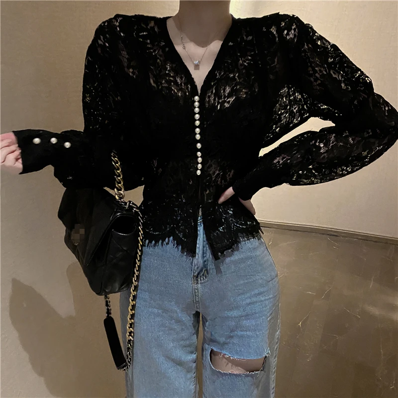 Отзывы о Женская кружевная блузка с V-образным вырезом и длинным рукавом-фонариком -