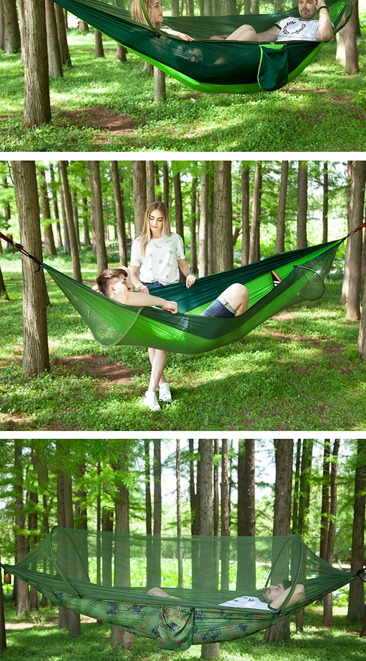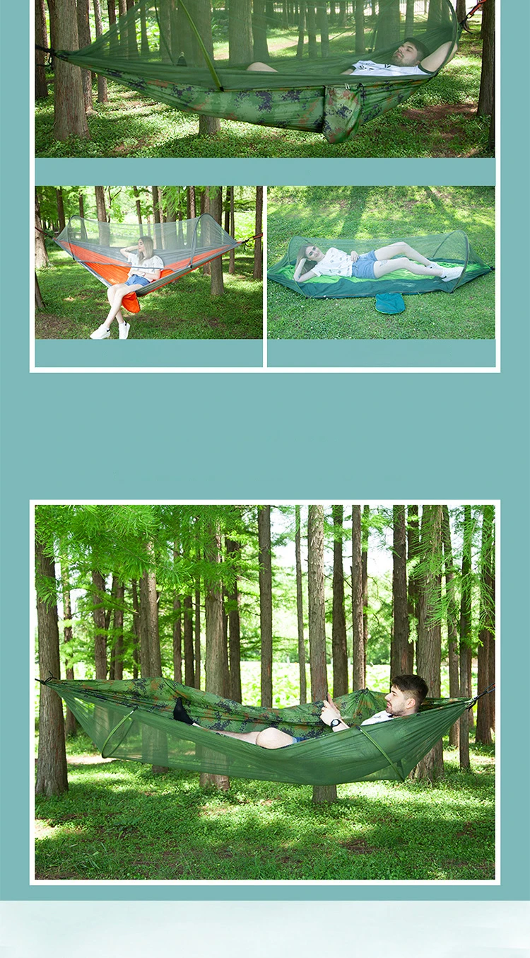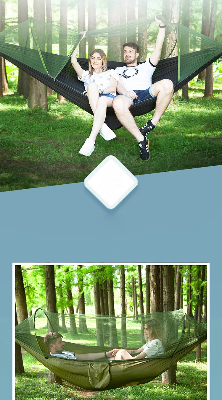 Hammock material: 70D Nisi spinning (also called 210T Nisi spinning, parachute cloth) Mesh material: polyester mesh Specification: 250 * 120CM // 290 * 140CM Weight: about 750g // 860g Load-bearing: 200KG Storage size: about 26 * 30 * 9CM // 28 * 35 * 9CM Packing: OPP bag packaging Configuration: No. 8 black gold steel buckle * 2, double ring tree belt * 2 (each 2 meters)