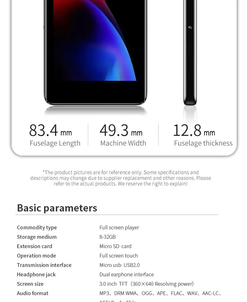 Описание памяти: 8 г = встроенный 8 г 40 г = Встроенная TF-карта 8 ГБ + 32 ГБ 64G = Встроенная TF-карта 8 ГБ + 64 ГБ 128 г = Встроенная TF-карта 8 ГБ + 128 ГБ Корпус: корпус из магниевого сплава Дисплей: 3,0 дюйма Разрешение экрана: 640*360 Размеры: 83,4*49,3*12,8 мм Память: 8 г Воспроизведение музыкального фона: Поддержка Синхронизация лирики LRC: Поддержка Повтор на A-B: Поддержка Режим воспроизведения: повтор, одна игра, все петли Функция tf-карты: Поддержка макс. карты памяти 128 ГБ Воспроизведение переменной скорости: 8 раз переключение Видео: 1080P (1920x1080) Поддержка формата HD: RM, H.264, Xvid, Mpeg2 и т. Д. Разрешение 720P (1280x720) поддержка: HD видео ниже 720P, без преобразования формата, можно играть напрямую Громкоговоритель: Поддержка Функция Радио: поддержка Будильник: поддержка Секундомер: Поддержка Текстовое чтение: Формат TXT, поддержка закладок Аккумулятор: полимерный аккумулятор 800 мА Функция записи: Поддержка записи микрофона Время работы: 20-35 часов воспроизведения песни в режиме экономии экрана наушников. Видео воспроизводит в течение 3-5 часов. Язык: Поддержка 29 языков s. Английский, русский, итальянский, иврит, японский, корейский. Испанский. Немецкий и т. Д. Формат аудио: APE, AAC, FLAC, MP3, WMA, OGG. Посылка включает в себя: 1 mp3-плеер 1x проводные наушники 1x USB кабель 1x Руководство пользователя Пожалуйста, обратите внимание: bluetooth MP3-плеера не может соединяться с компьютерами и телефонами! Посылка, указанная выше, не входит в комплект. Примечание: освещение и различные дисплеи могут привести к тому, что цвет товара на картинке немного отличается от реального. Допускается погрешность в измерениях +/- 1-3 см.