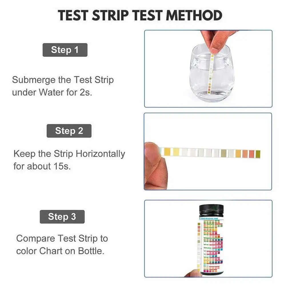 Простота в использовании: окуните тестовую полосу питьевой воды в воду в течение 2 секунд, затем удерживайте ее в воздухе около 1 минуты, затем Отрегулируйте цвет бутылки, чтобы получить чтение.