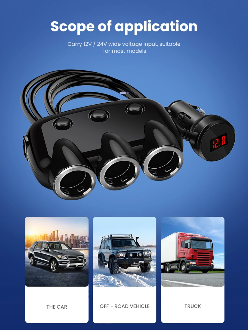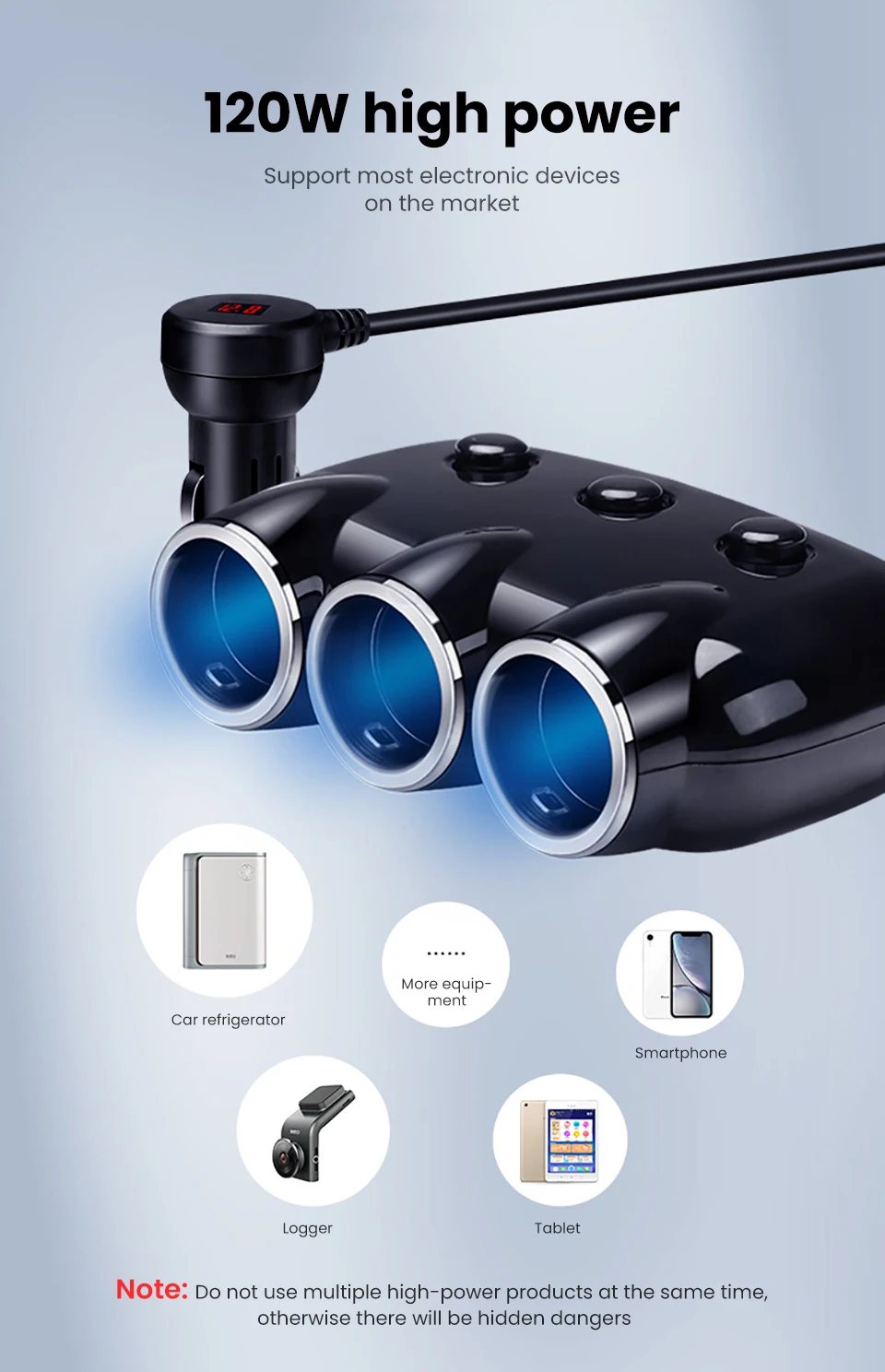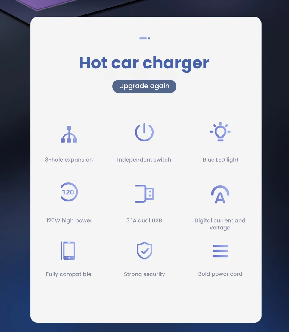 Product parameters Colour: Black Product size: 100mmX66mmX30mm Power cord length: 560mm Material: high quality ABS engineering plastic Packaging: Hanging high-end white card + blister packaging Input: DC12-24V Three-point smoke hole: 120W (no cigarette lighter) USB output voltage: DC5V USB output current: 1A + 2.1A Scope of application: mobile phone, tablet computer, PSP, navigator, car MP3, Car refrigerator, car vacuum cleaner, digital camera and other electrical products