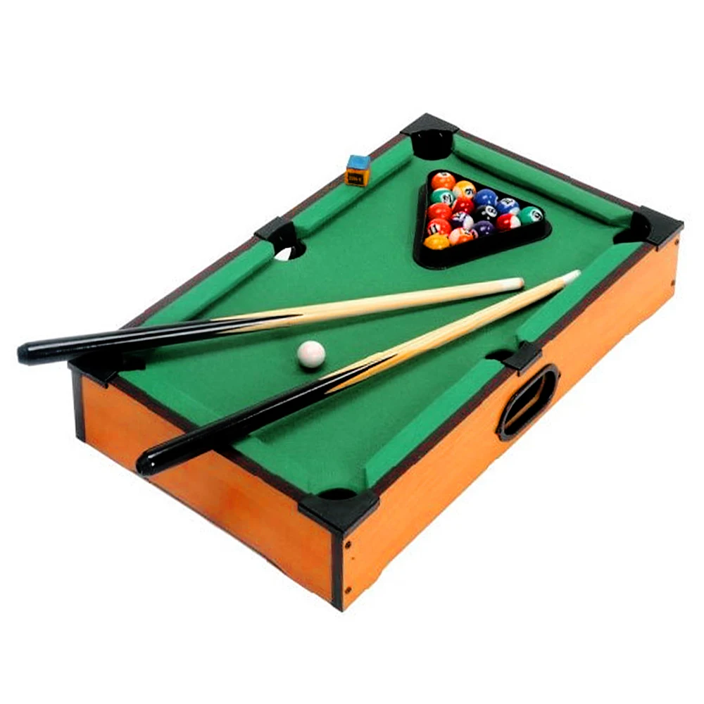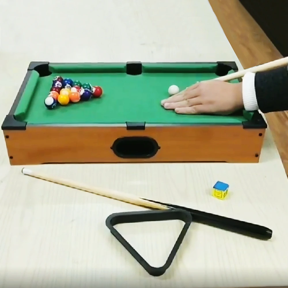 Бильярдный набор включает в себя 1 бильярдный стол, 2 палочки, 16 шариков, 1 бильярдный мел и 1 треугольную стойку.