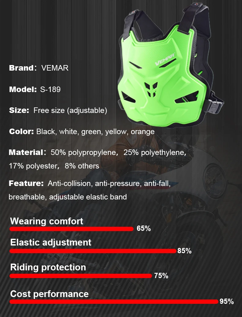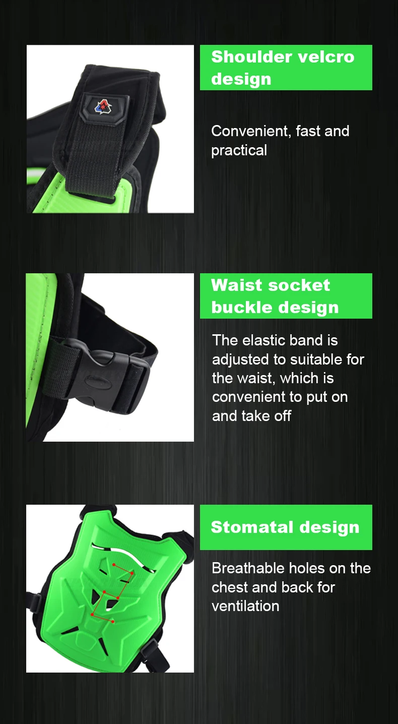 О броне: Комфорт при ношении 65% эластичная Регулировка 85% защита верховой езды 70% эффективность затрат 95%Характеристика:Анти-столкновение, анти-давление, анти-падение, дышащий, регулируемый эластичный ремешок1. Защитное снаряжение для мотоцикла 2. Броня для мотокросса 3. Оборудование для внедорожных гонок 4. Защитный жилет для груди/спины 5. Защита для езды на мотоцикле Подробное описание:1. Дизайн на липучке (удобный, быстрый и практичный) 2. Дизайн с пряжкой на талии (эластичная лента регулируется на талию, что удобно надевать и снимать) 3. Стоматологический дизайн (дышащие отверстия на груди и спине для вентиляции)