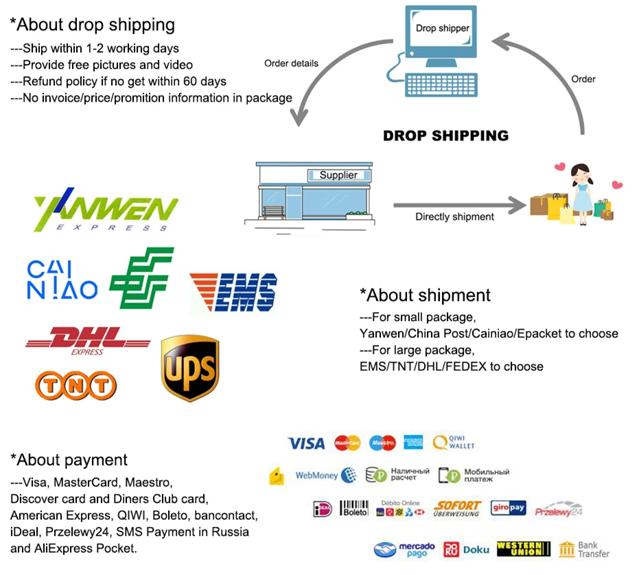 1. Мы обычно осуществляем заказы в течение 24 часов после получения платежа. Вышеуказанная дата доставки только для справки, иногда задерживается в праздничные дни, фестивали, плохая погода, таможня и т. д. 2. Цена не включает таможенную пошлину, плату за отдаленные районы или другие платные сборы от курьера. Вам нужно заплатить на 30 долларов США больше, если ваш адрес находится в удаленном районе. 3. Мы также предлагаем Экспресс-доставку, как DHL, UPS, EMS и т. Д., пожалуйста, не стесняйтесь связаться с нами, если вы срочно нуждаетесь в нем или количество большое. 4. Мы принимаем возврат и возмещение в течение 15 дней после завершения заказа, пожалуйста, свяжитесь с нами.