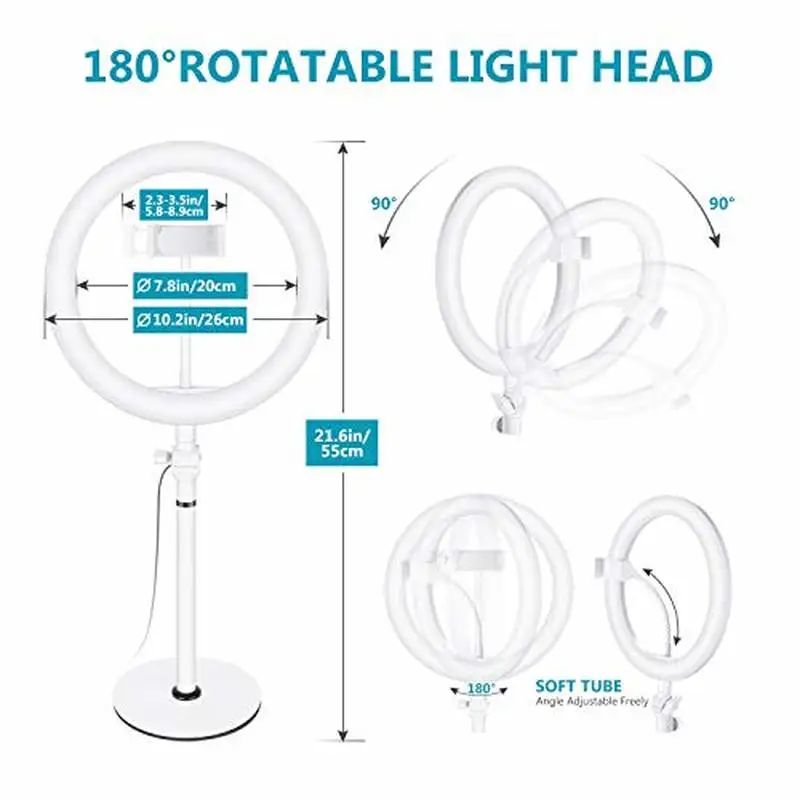 * Премиум светодиодный свет: Изготовлен из специальных энергосберегающих светодиодных бусин 120 шт. и питается от постоянного тока; Низкое энергопотребление; Низкое тепловыделение; безопасная и экологически безопасная, обеспечивая бестеневое и равномерное освещение, чтобы помочь вам выглядеть более красиво* Регулировка яркости: 3 режима освещения (белый, желтый + белый, желтый) и 10 уровней яркости могут удовлетворить все ваши потребности; световая головка может быть легко отрегулирована спереди и сзади на 180 градусов через фиксирующую ручку; Кольцевая световая головка также может быть установлена на осветительной подставке через Универсальный винтовой адаптер 1/4 дюйма (Адаптер не входит в комплект)