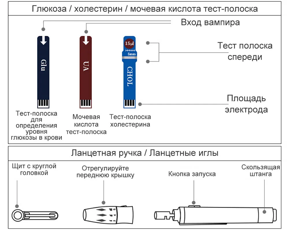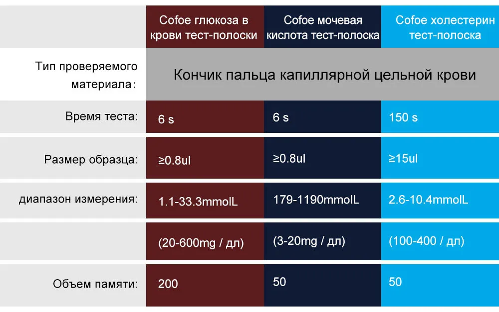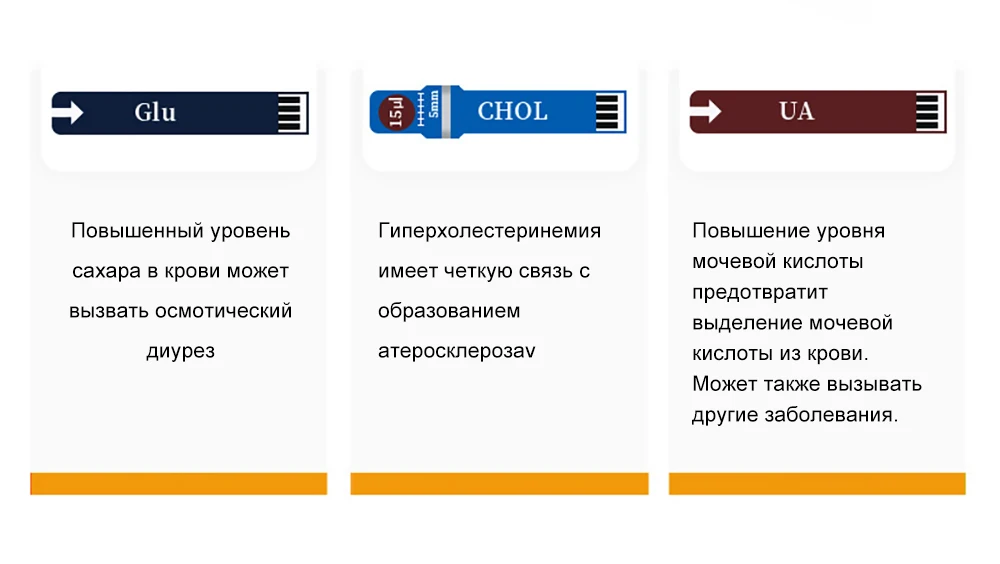 1) тест на глюкозу: Если уровень глюкозы в крови и глюкозы в крови в течение 2 часов после еды выше, чем обычно, заподозрен диабет 2) общий уровень холестерина: Высокий общий уровень холестерина представляет собой высокий уровень жира в крови, который вызывает резистентность к инсулину. Устойчивость к инсулину сама по себе повышает уровень холестерина, и как только уровень инсулина снижается, уровень сахара в крови увеличивается. 3) Мочевая Кислота: Это для справки о подагре, если Мочевая Кислота слишком высока в организме человека, то происходит подагра. Поэтому этот продукт может точно измерить значение мочевой кислоты, чтобы определить, существует ли подагра.