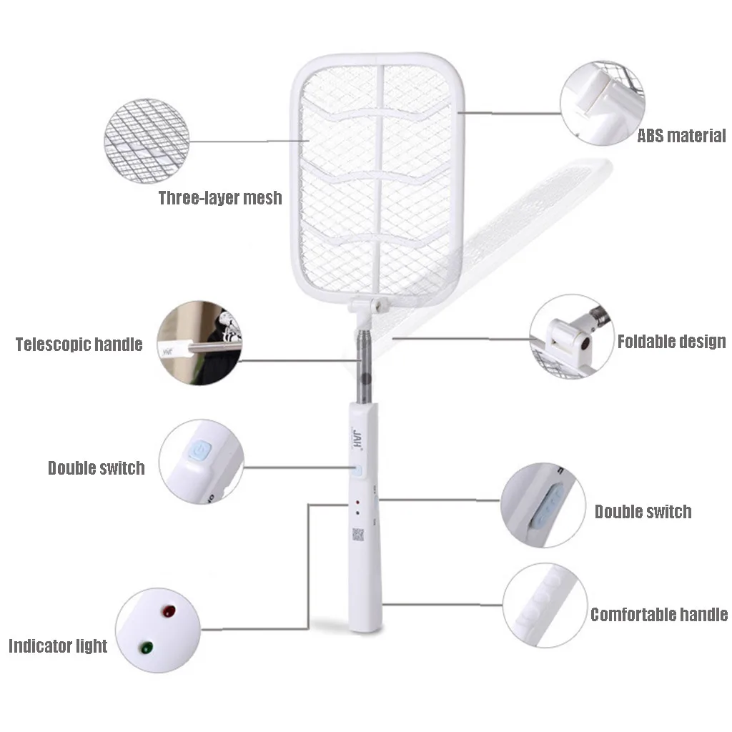 Трехслойная сетка. Телескопическая ручка. Двойной переключатель. Световой светильник. Материал ABS. Складная конструкция. Двойной переключатель. Удобная ручка.