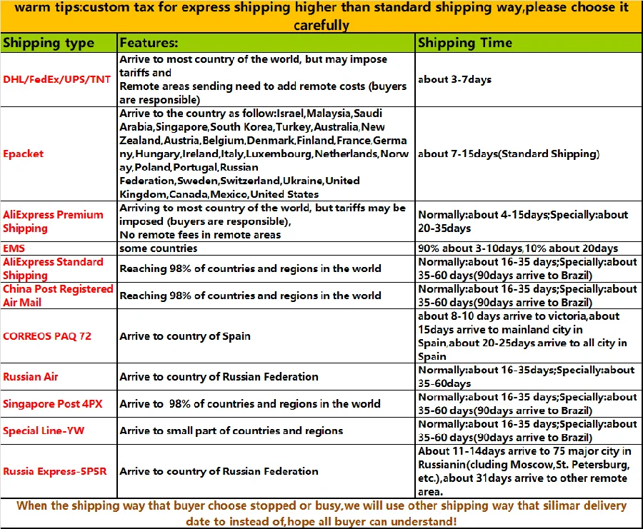 Доставка:Перед тем, как расписаться, чтобы получить посылку, когда вы получите свой заказ, пожалуйста, проверьте, повреждена ли посылка, если она повреждена, пожалуйста, подайте жалобу в вашу транспортную компанию и отправьте нам номер жалобы с фото поврежденных деталей, мы ответим вам как можно скорее и ответим Вам!
