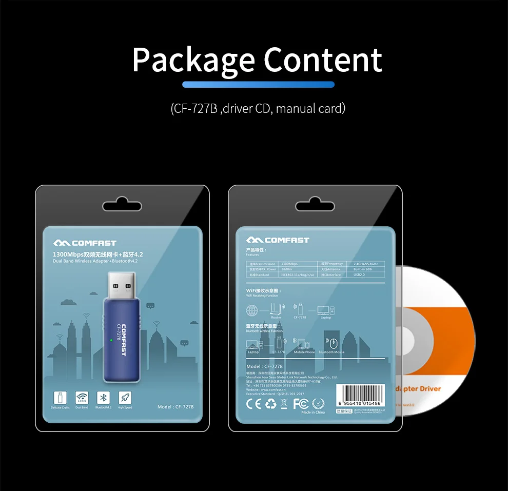 Технические характеристики: Подключи и Bluetooth 4,2 быстрая передача данных Стандарты: IEEE 802.11AC, 802.11b, 802,11g, 802.11n Цвет: синий Шифрование: wep-шифрование, WPA-PSK, WPA2-PSK Примечание: Поддержка Wifi Операционная система: WIN 7/WIN8/WIN8.1/WIN 10 (32 бита, 64 бита) Mac OS 10,6-Mac OS 10,15 (Wifi) Драйвер Bluetooth не поддерживает Windows XP/Vista/MAC