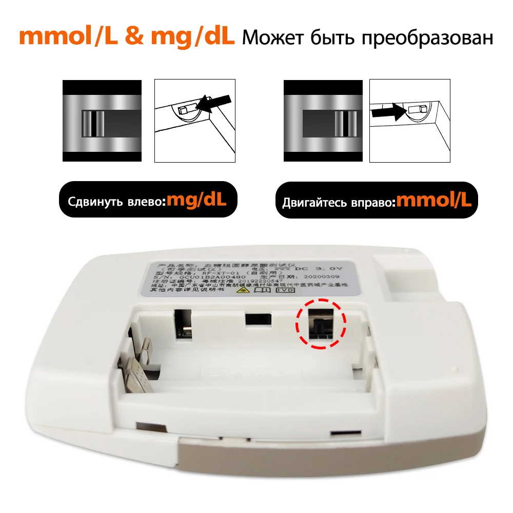 --- Метод работы: откройте батарейный отсек машины, и вы увидите черный файл настройки, перемещение влево - мг / дл, перемещение вправо - ммоль / л (единица измерения мочевой кислоты - мкмоль / л).