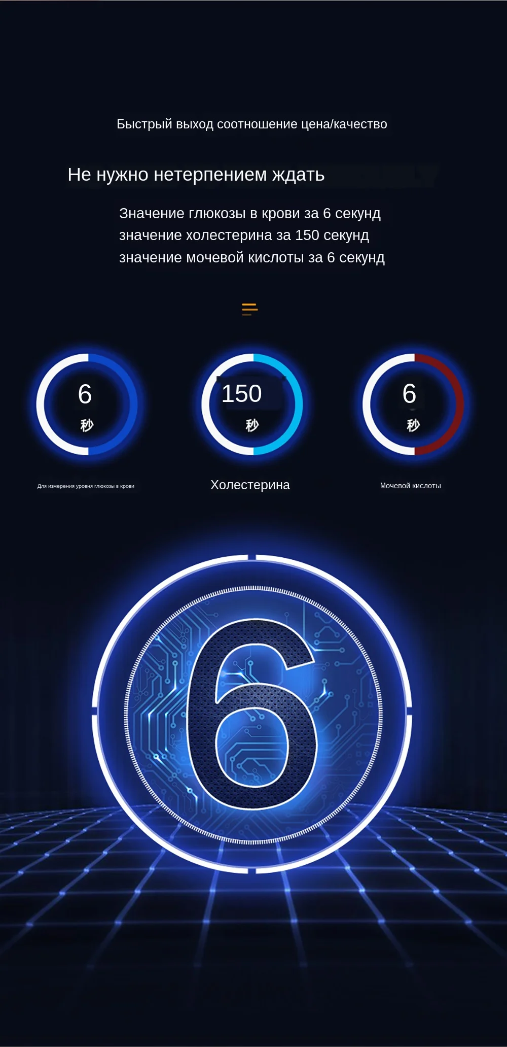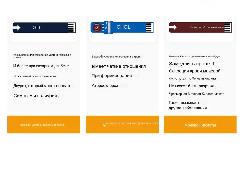 1) тест на глюкозу: Если уровень глюкозы в крови и глюкозы в крови в течение 2 часов после еды выше, чем нормальный, есть подозрения в диабете 2) общий Холестерин: Высокий общий холестерин представляет собой высокий жир в крови, который вызывает устойчивость к инсулину. Устойчивость к инсулину сам по себе повышает уровень холестерина, и как только уровень инсулина падает, уровень сахара в крови повышается. 3) Мочевая Кислота: Это для примера подагры, если Мочевая Кислота слишком высока в человеческом теле, то настанет подагра. Поэтому этот продукт может точно измерить значение мочевой кислоты, чтобы определить, есть ли подагра.