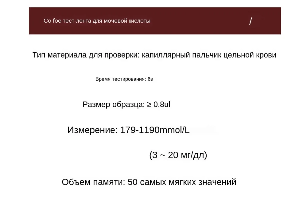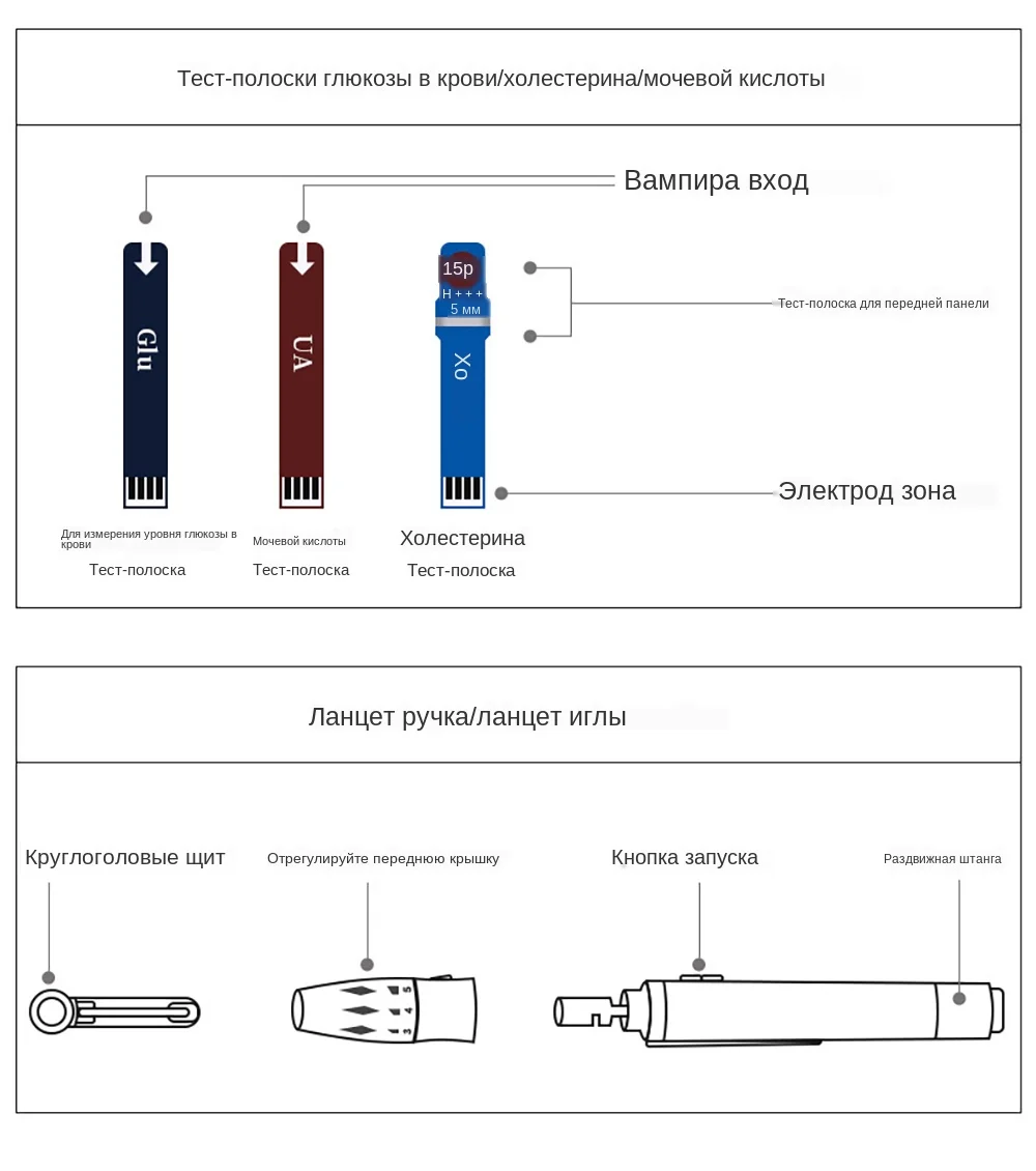Система мониторинга уровня сахара в крови, мочевой кислоты и холестерина Предназначен для проверки концентрации холестерина в крови, Уровень сахара в крови или мочевой кислоты во всей крови. Не подходит для обнаружения новорожденных. Тестовая Бумага может использоваться только для обнаружения концентрации холестерина, сахара в крови или мочевой кислоты в свежей крови кончиков пальцев. Примечание: Если вам нужно, у нас есть руководство на английском языке!