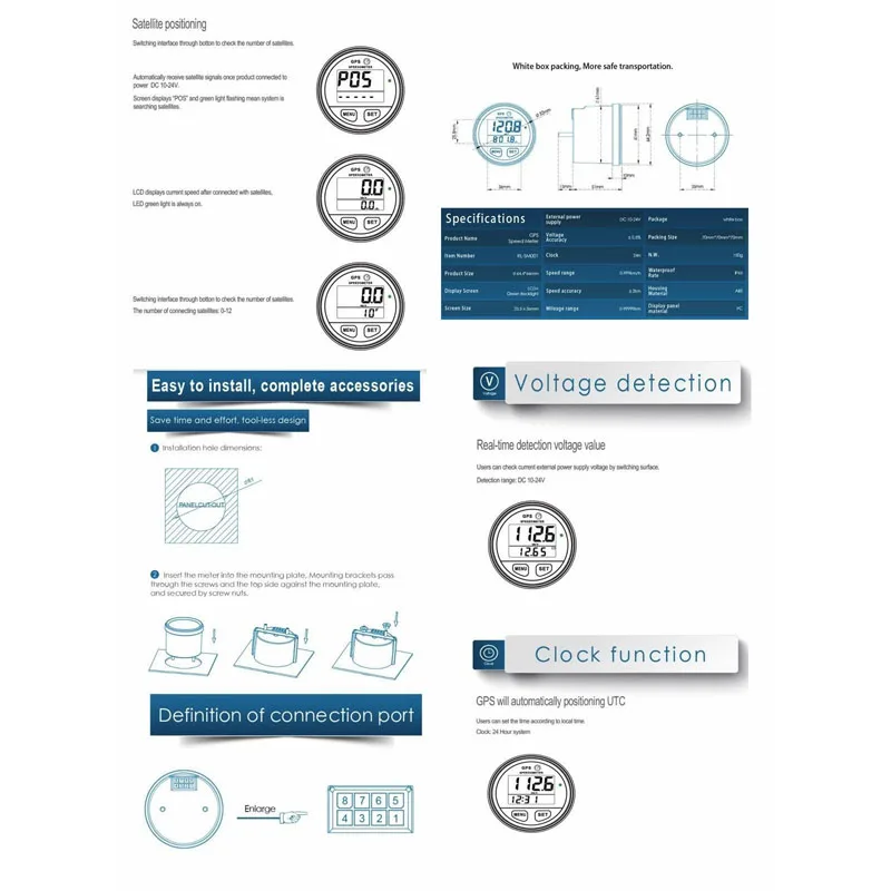 * Простота установки. Не требуется внешняя антенна, просто подключите DC 12-24 вольт. Подходит для стандартных отверстий для измерительных приборов 60 мм (2,36 дюйма)